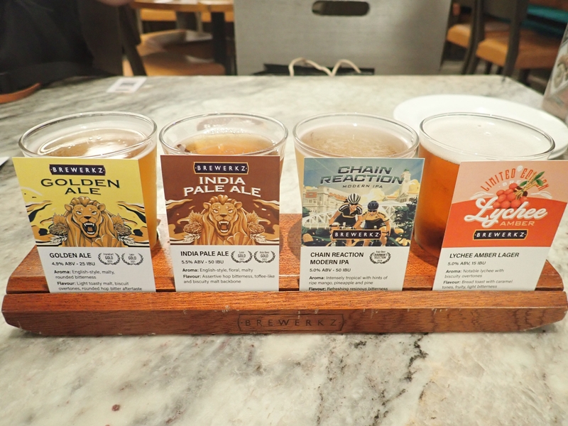 ビール好きの方にぜひ行ってほしい、クラフトビールの名店、Brewerkz。シンガポールで歴史あるクラフトビールのあるレストランです。訪れたのはリバーサイドポイント店で、夜は賑やかなエリアです。ここで頼んだのは様々なクラフトビールが楽しめるサンプラー4種(26シンガポールドル)。20種類の中から、好きな味のクラフトビールを選びました。おつまみにはサテーを。タレがピリ辛だったので、ビールですっきりと楽しく味わえました。リバーサイドポイント店以外にも5店舗ありますので、公式サイトで確認してみてください。