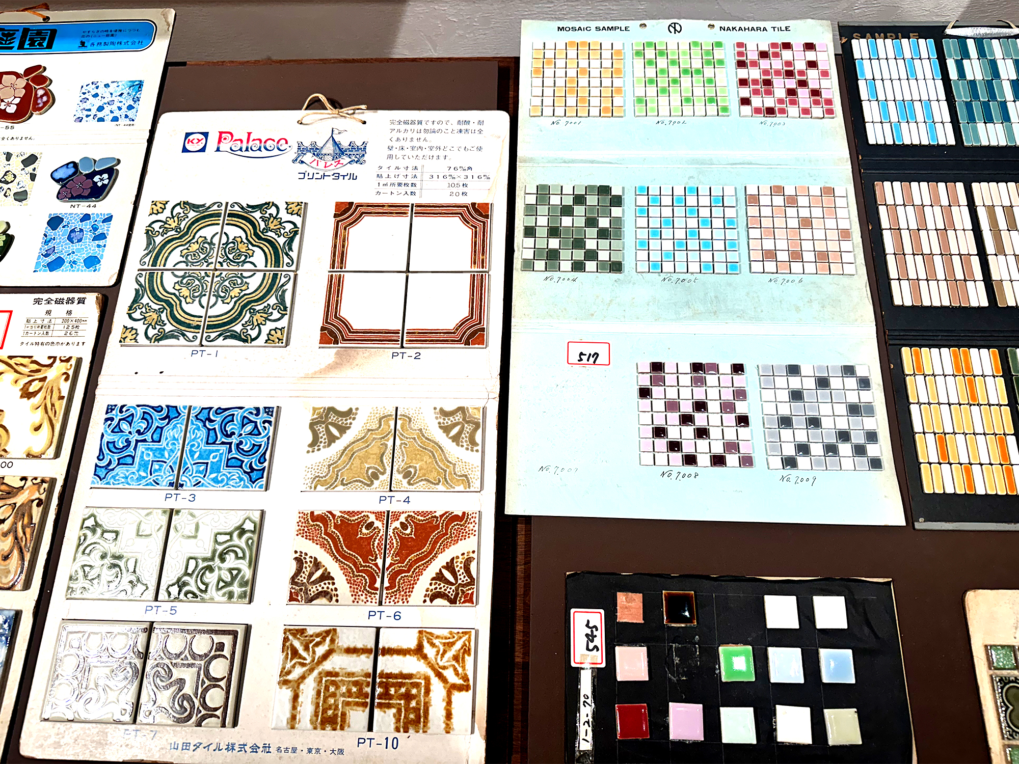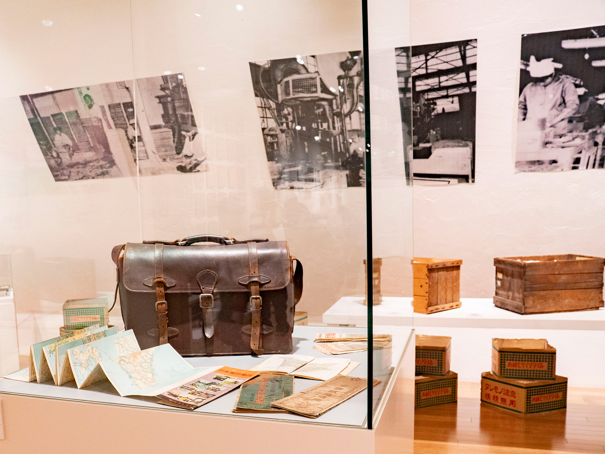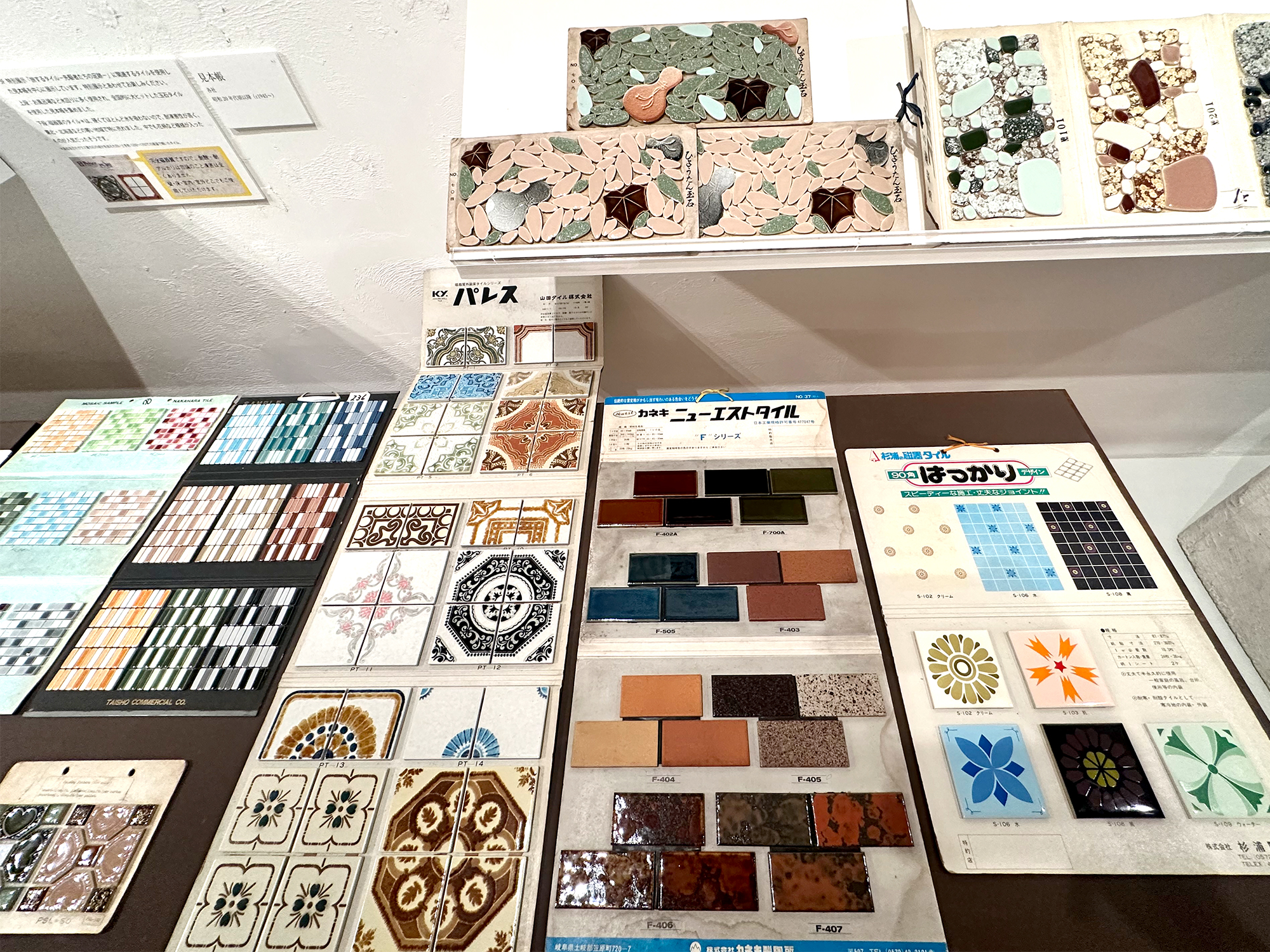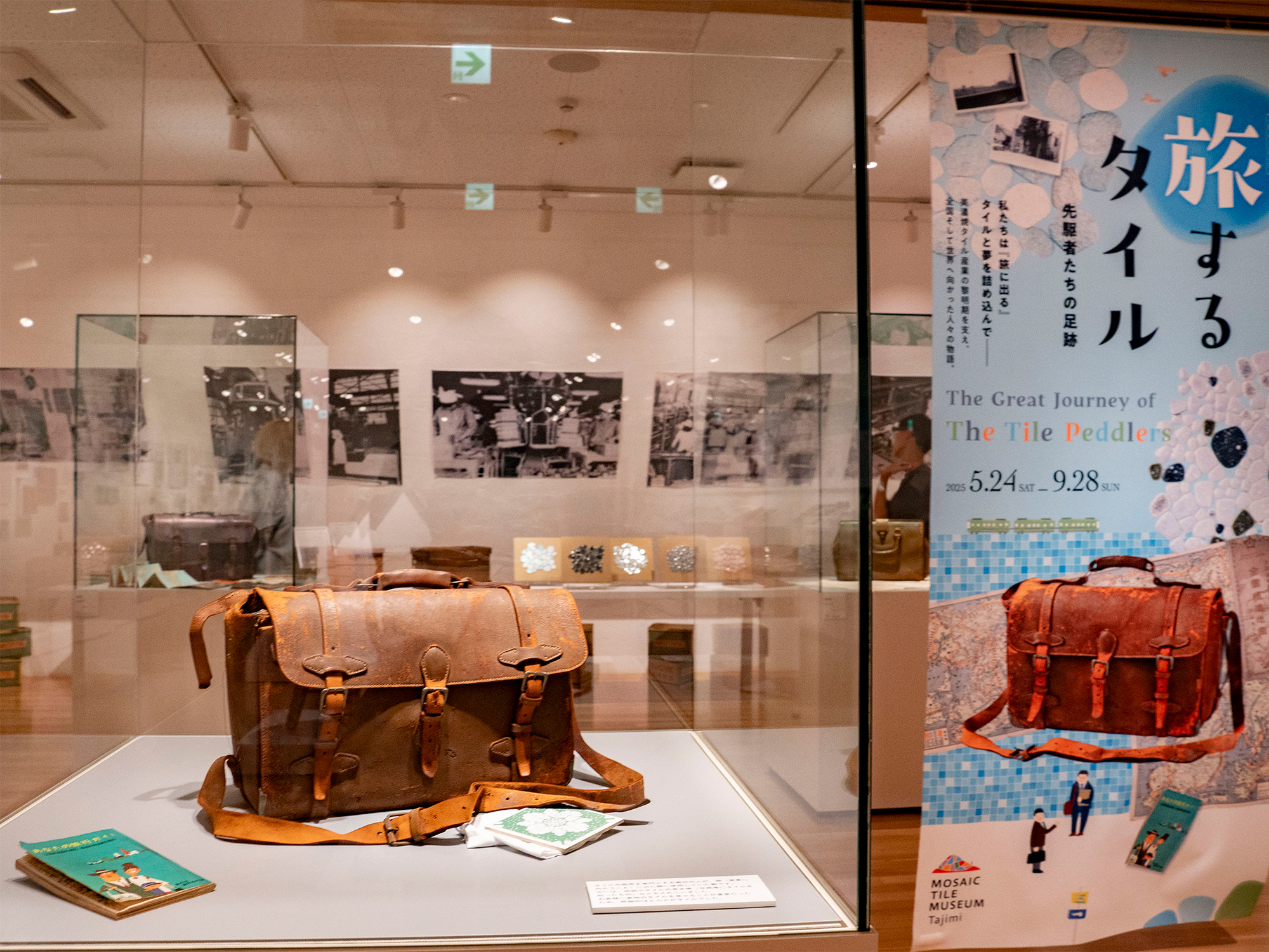 会場には、営業の”旅”に欠かせなかった革製の鞄や、当時使用されていたタイル見本帳(台紙に実物のタイルを貼り付けたもの)などの実物が展示されています。見本帳のデザインやタイルの貼り方には工夫が凝らされており、昭和レトロな懐かしい雰囲気が感じられます。