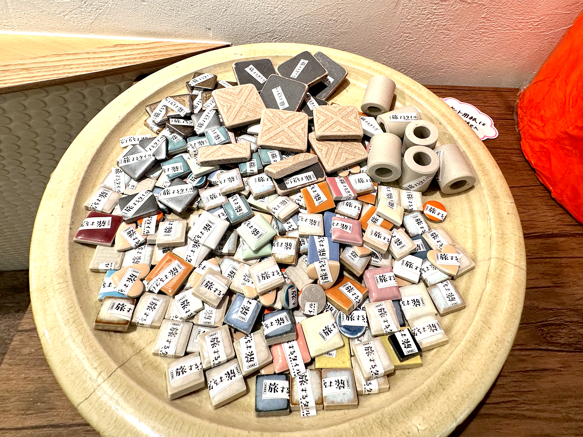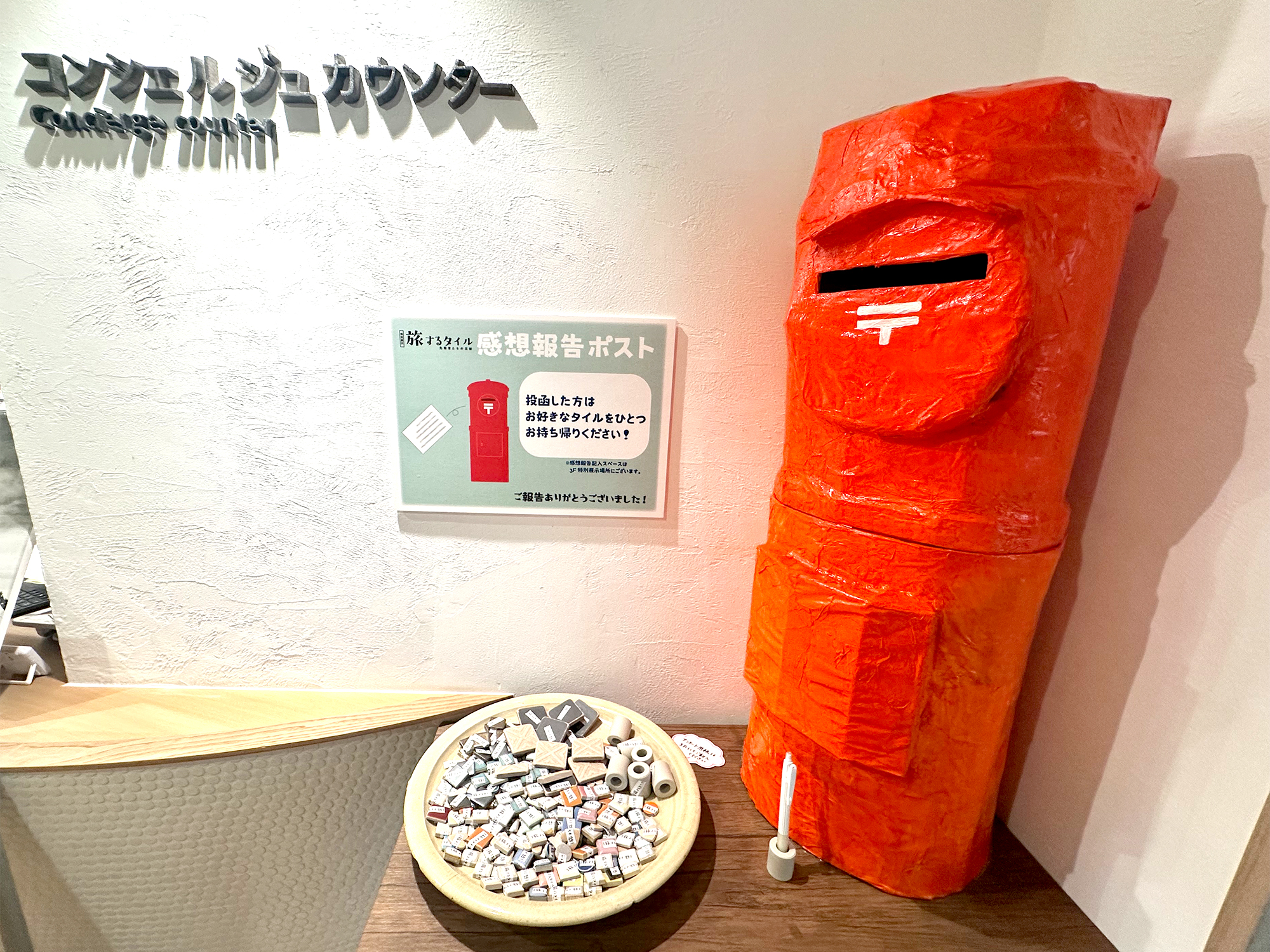 当時は、タイル商社の営業担当者が、旅先から日々の売上や注文状況をはがきに記し、ポストに投函することがあったそうです。その習慣になぞらえて、会場には「感想ポスト」が設置されており、展示の感想を書いて投函すると、タイルが1つもらえるという、企画も行われています。