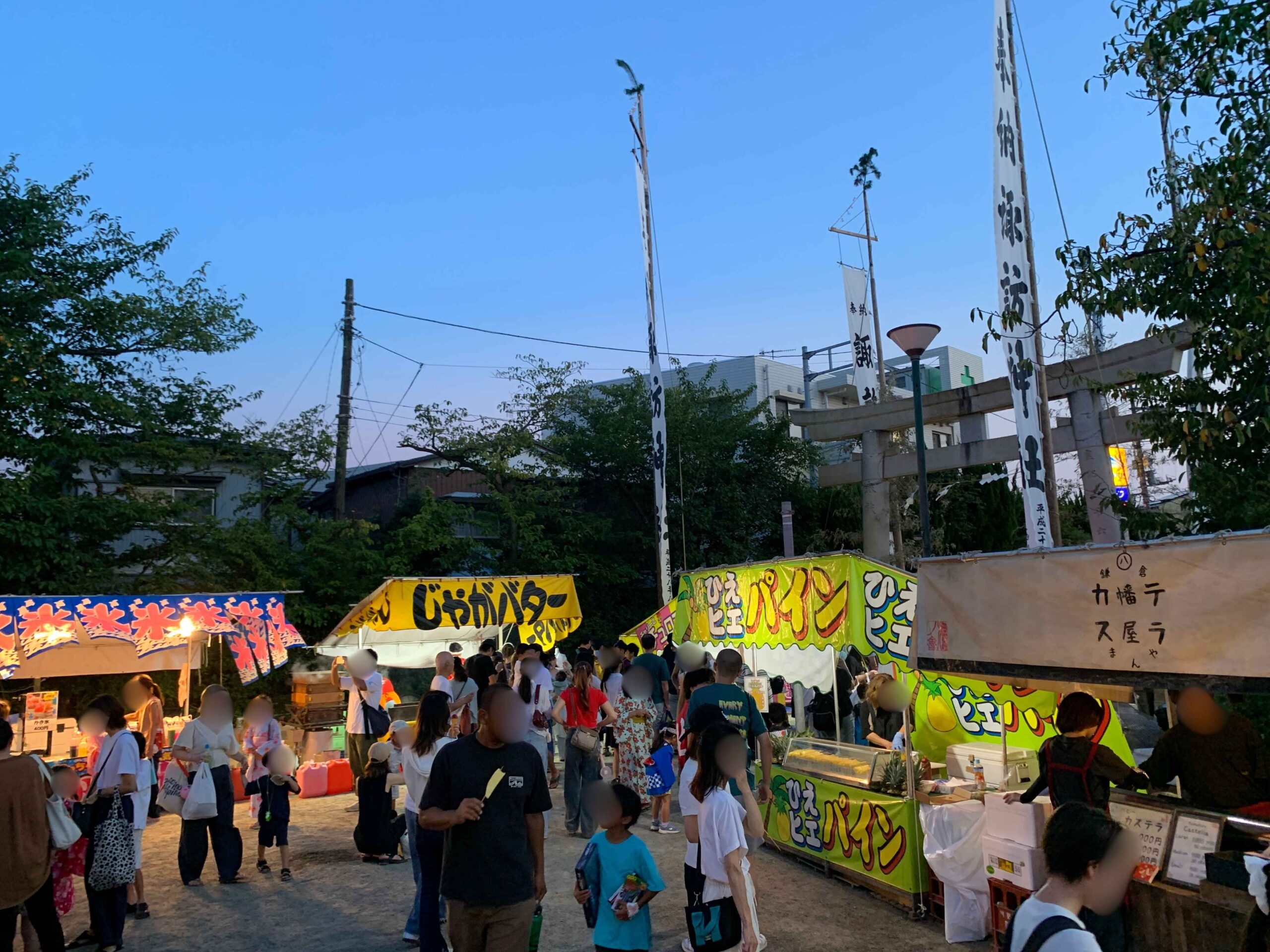 8月26日・27日の夜は、境内いっぱいに屋台が並びます。焼き鳥やチョコバナナの香りに誘われて歩いていると、子どもたちの歓声が響く射的やスーパーボールすくいも。どちらかというと昔ながらの露店が並び、懐かしいお祭りです。