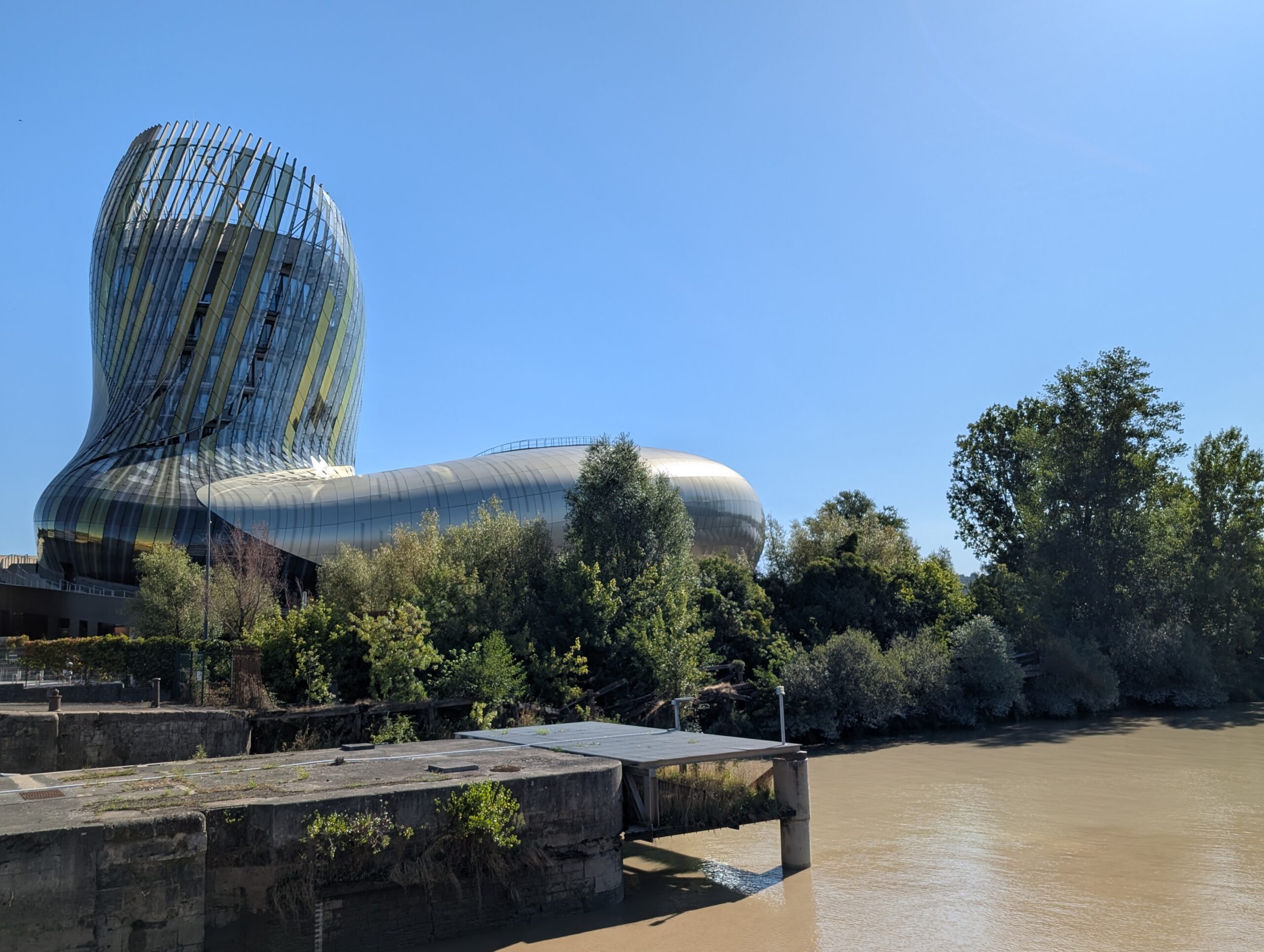 ボルドー観光の定番といえば、真っ先に名前が挙がるのが「Cité du Vin(シテ・デュ・ヴァン)」。ガロンヌ川沿いに立つ、その曲線的で未来的な建物は遠くからでも目を引き、思わず足を止めたくなる存在感があります。