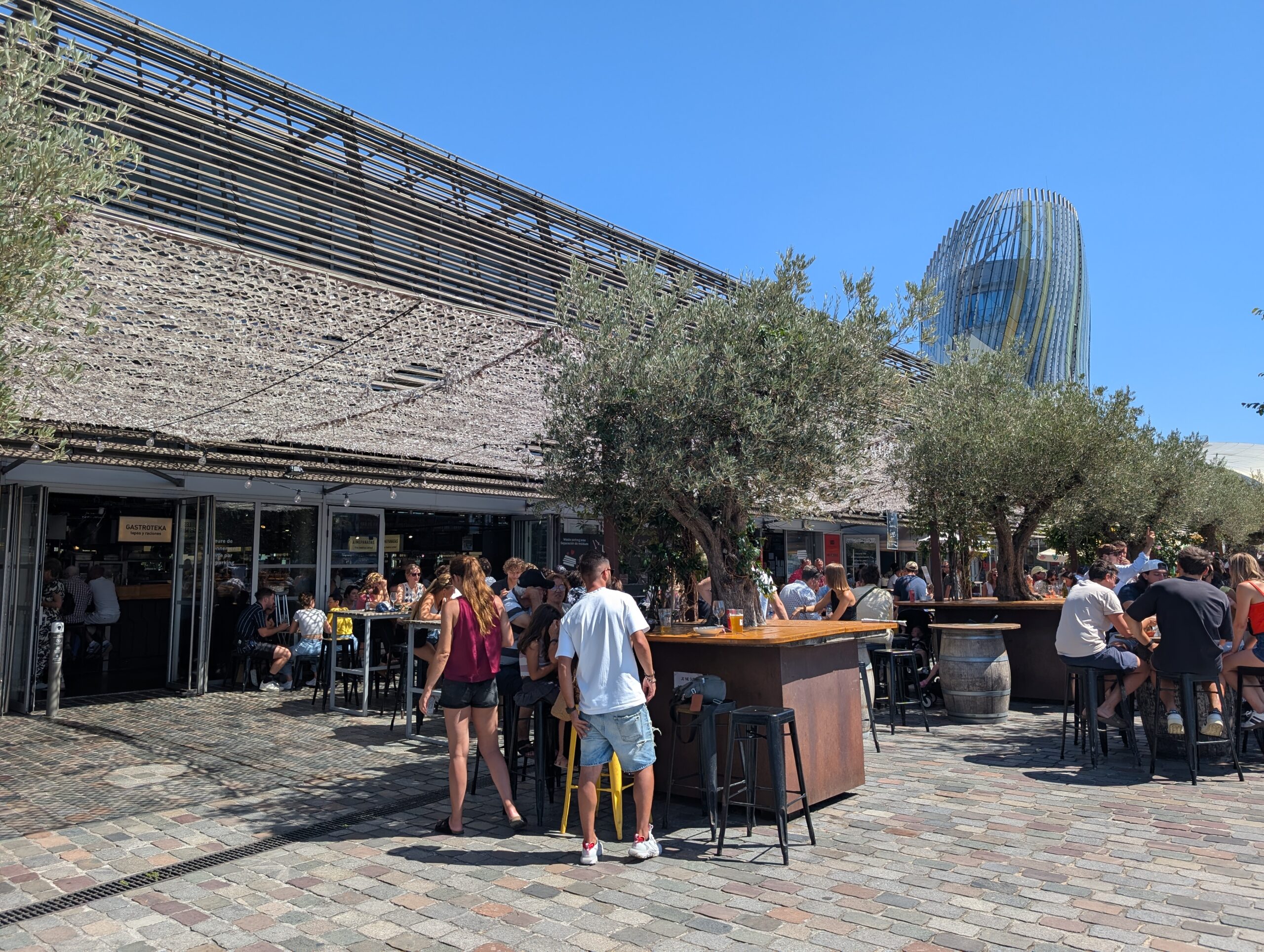 もうひとつは、道路を挟んで向かい側にあるフードホール「Les Halles de Bacalan」。テラス席も広く、晴れた日には川沿いの風を感じながら食事ができます。牡蠣やチーズ、シャルキュトリーなどボルドーの名物を少しずつ楽しむことができ、観光客だけでなく地元の人々にも人気です。