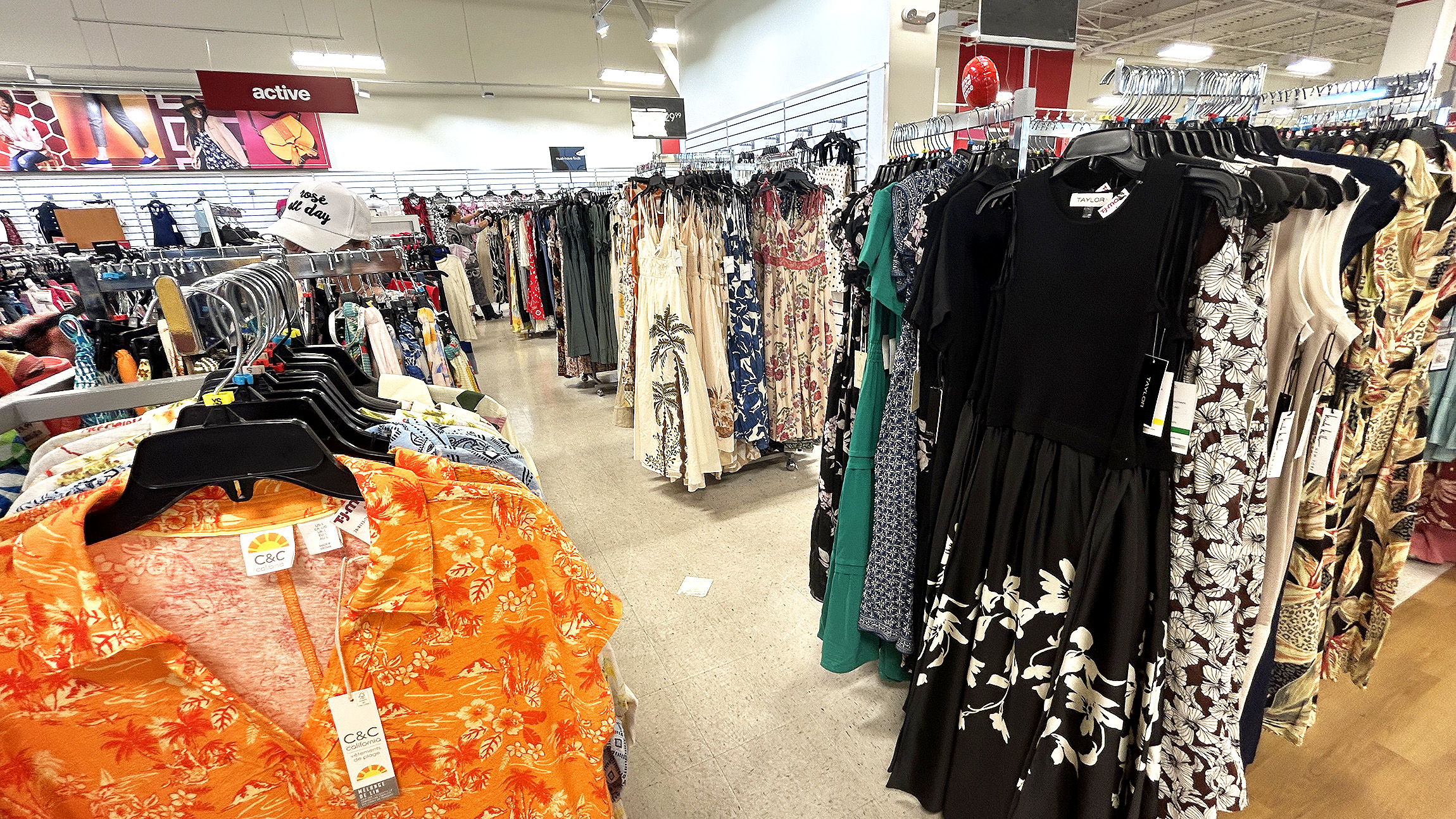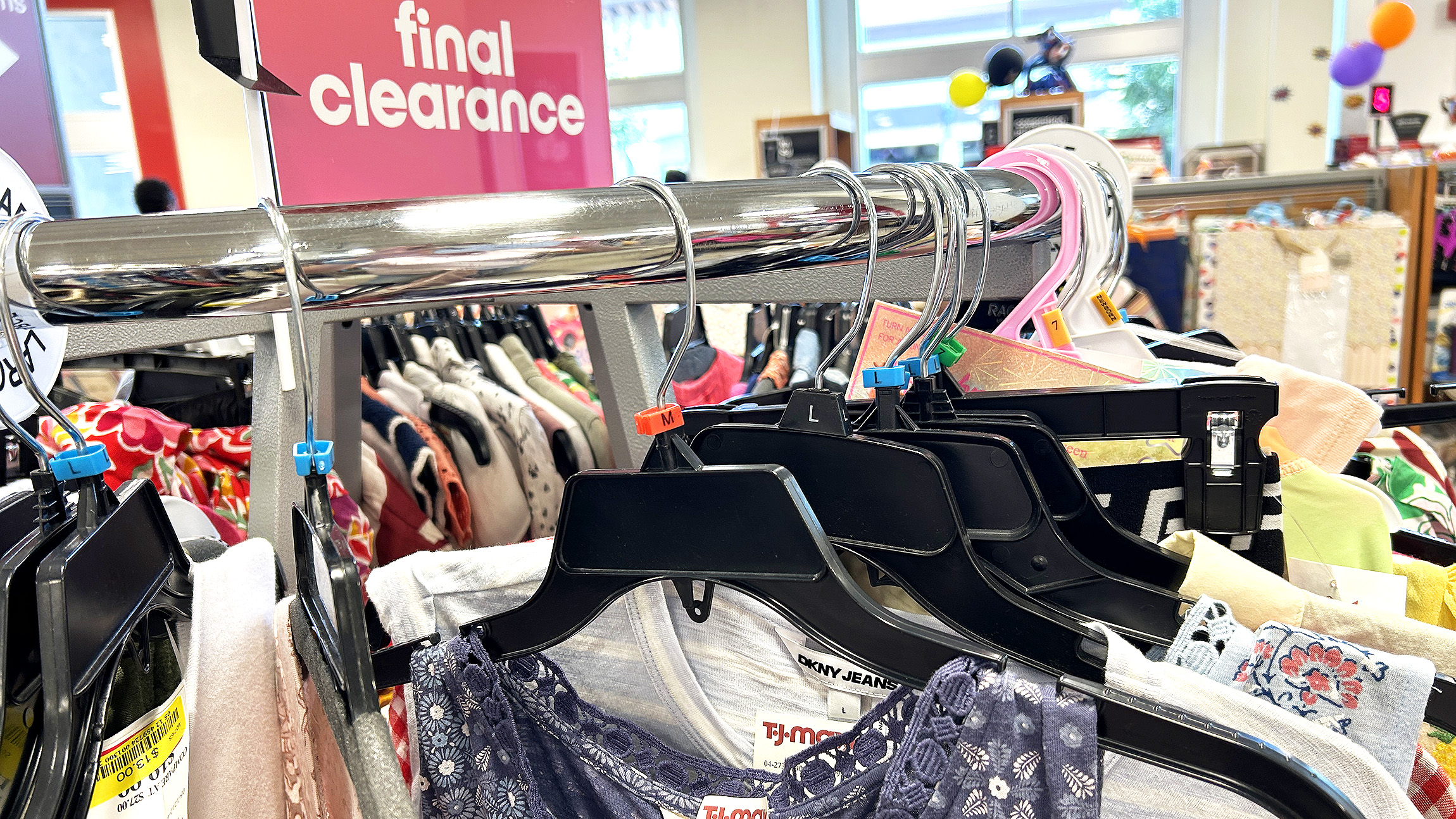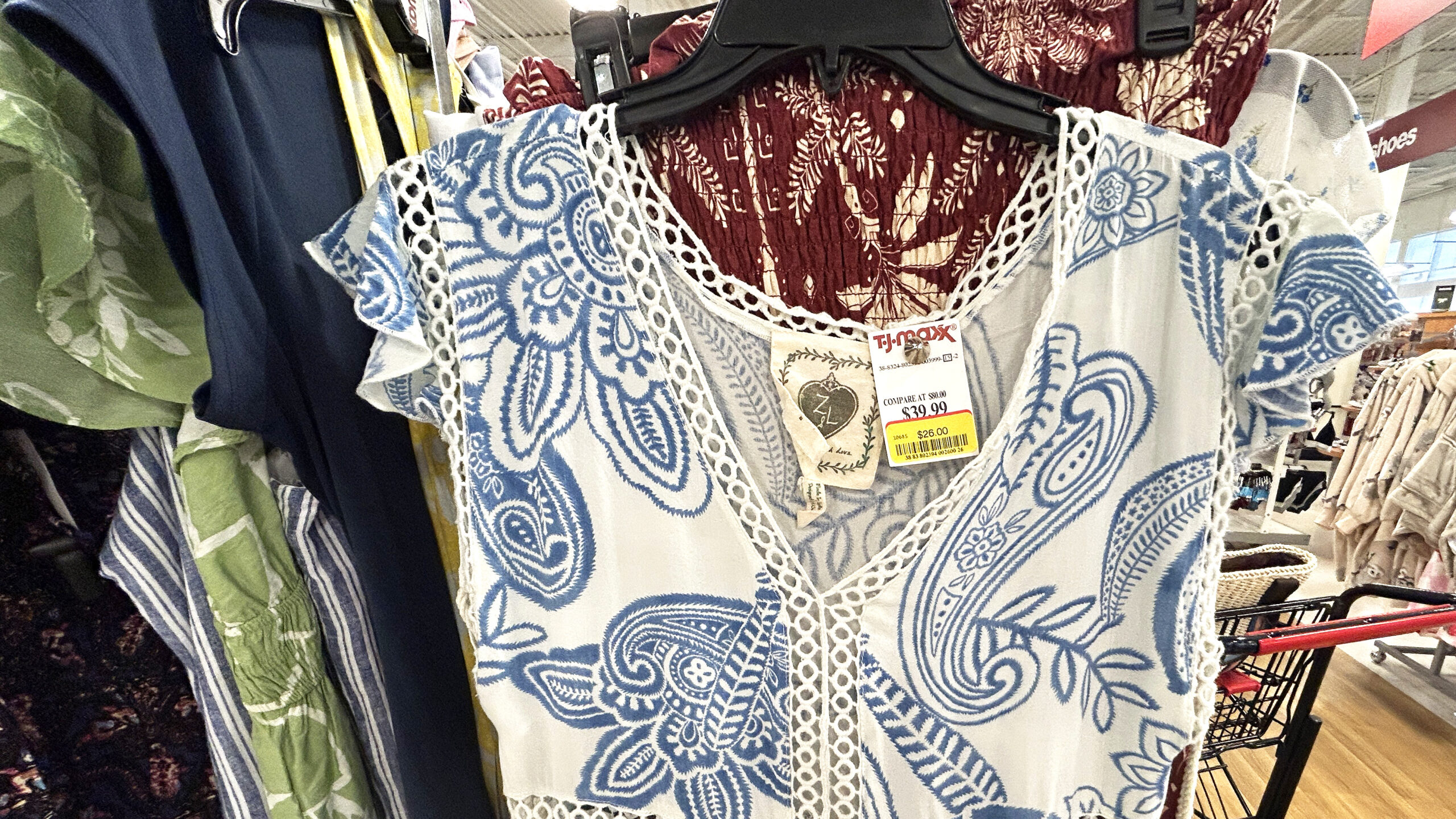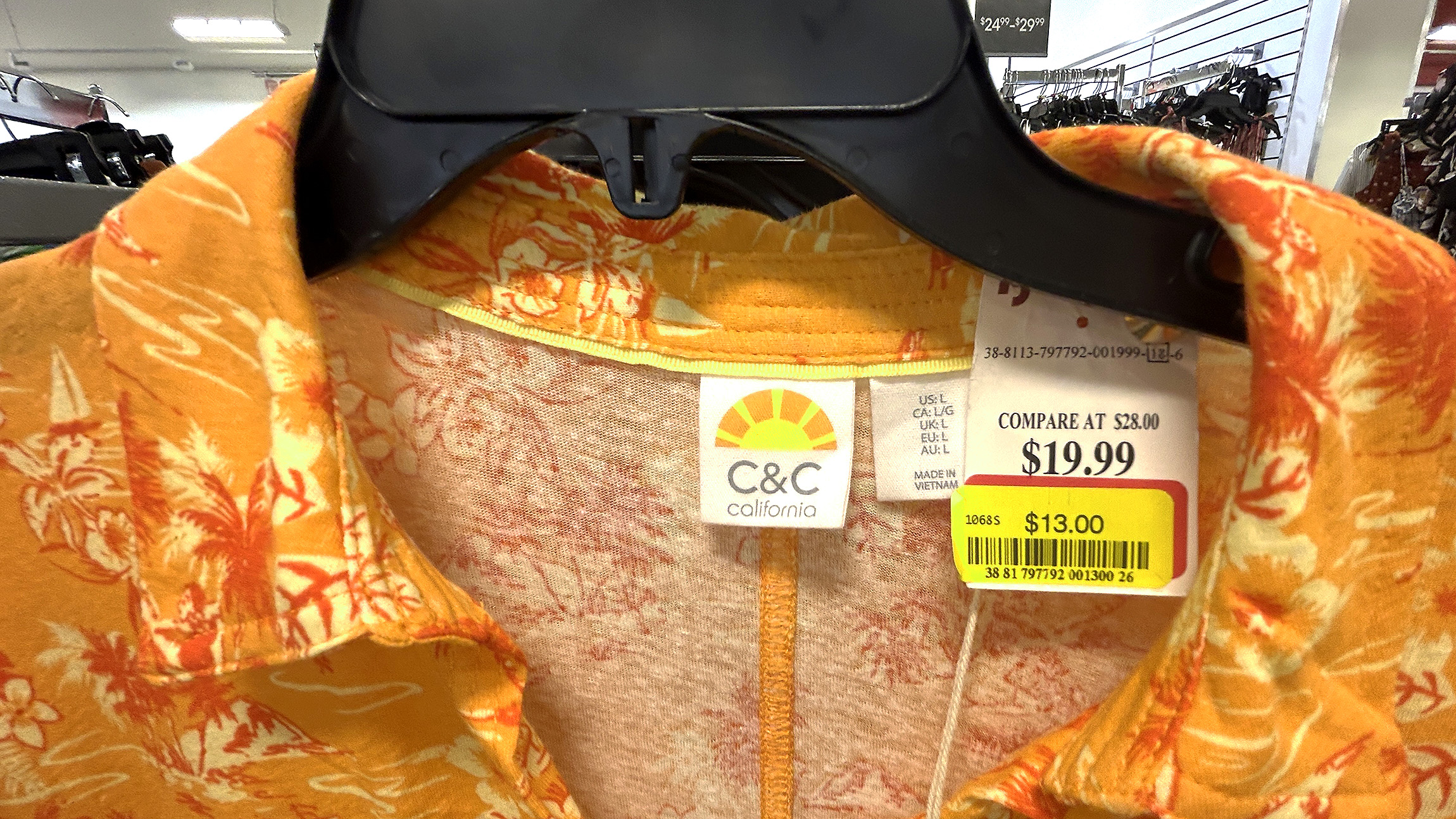 たとえば、このトップスの値札を見てみると……白い値札に大きく書かれた19.99ドル(約2940円)がTJ Maxxの通常価格で、その上に書かれている「Compare at 28.00ドル(約4118円)」は、デパートなどでの参考価格を表しています。この値札には赤いシール(クリアランス価格)の上に黄色いシール(最終処分価格)が貼られており、最終的な販売価格は13.00ドル(約1911円)であることがわかります。