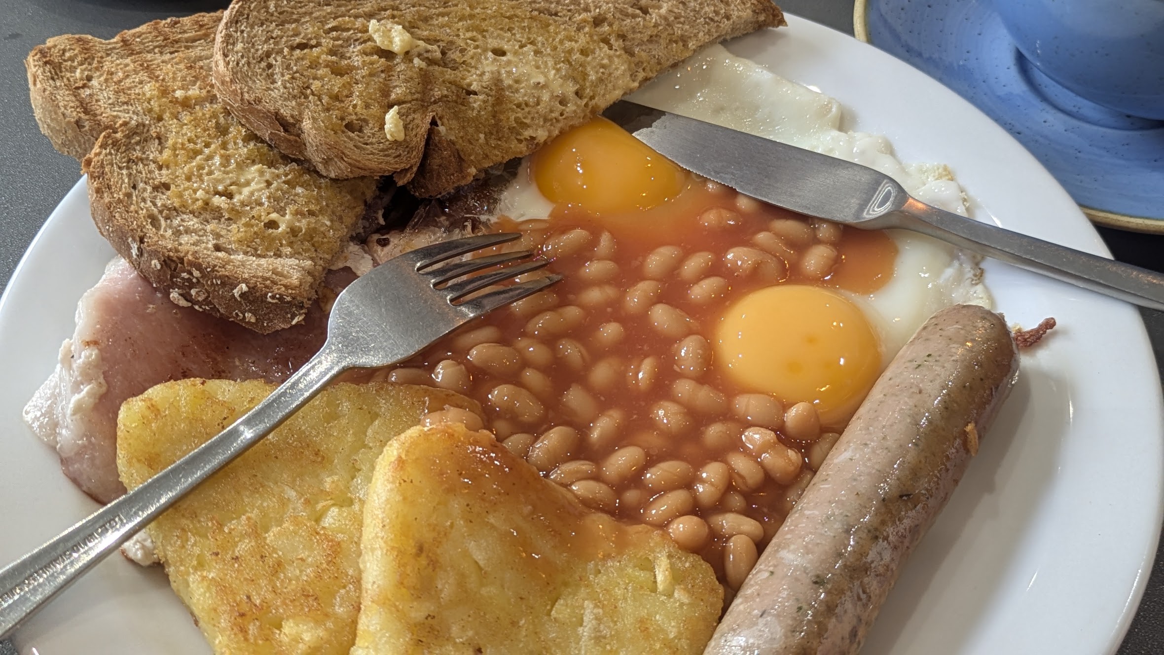 イングリッシュ・フル・ブレックファーストは、ベーコン、ソーセージ、卵、ベイクドビーンズ、ハッシュブラウン、トーストなどが一皿に収まった豪華版。