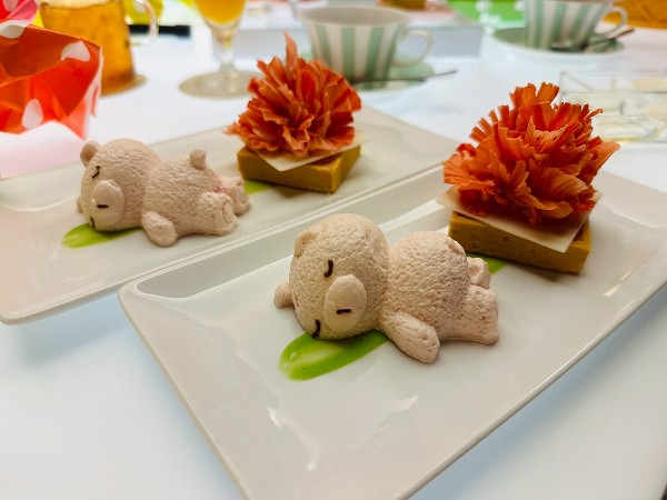 メニューには「クマさん」と書かれていて、別皿で提供される可愛いクマさん。食べるのをためらうほど愛らしい見た目ですが、ナイフを入れると中からラズベリーソースがとろり。