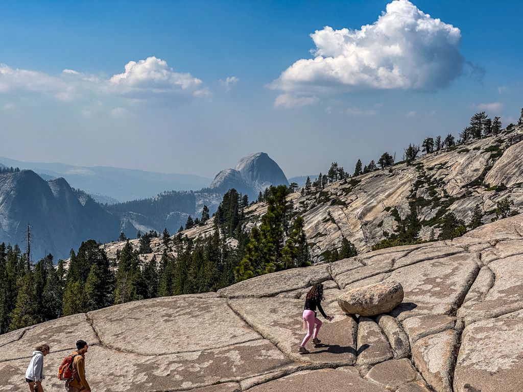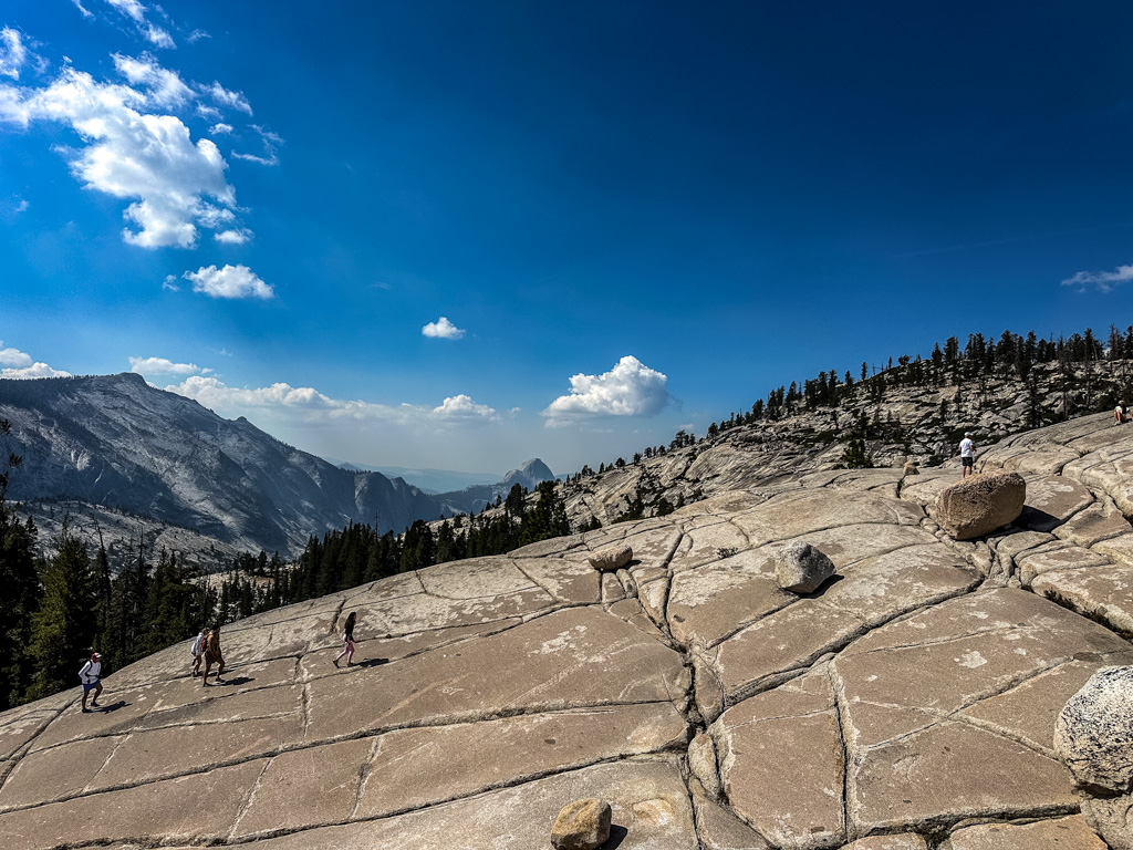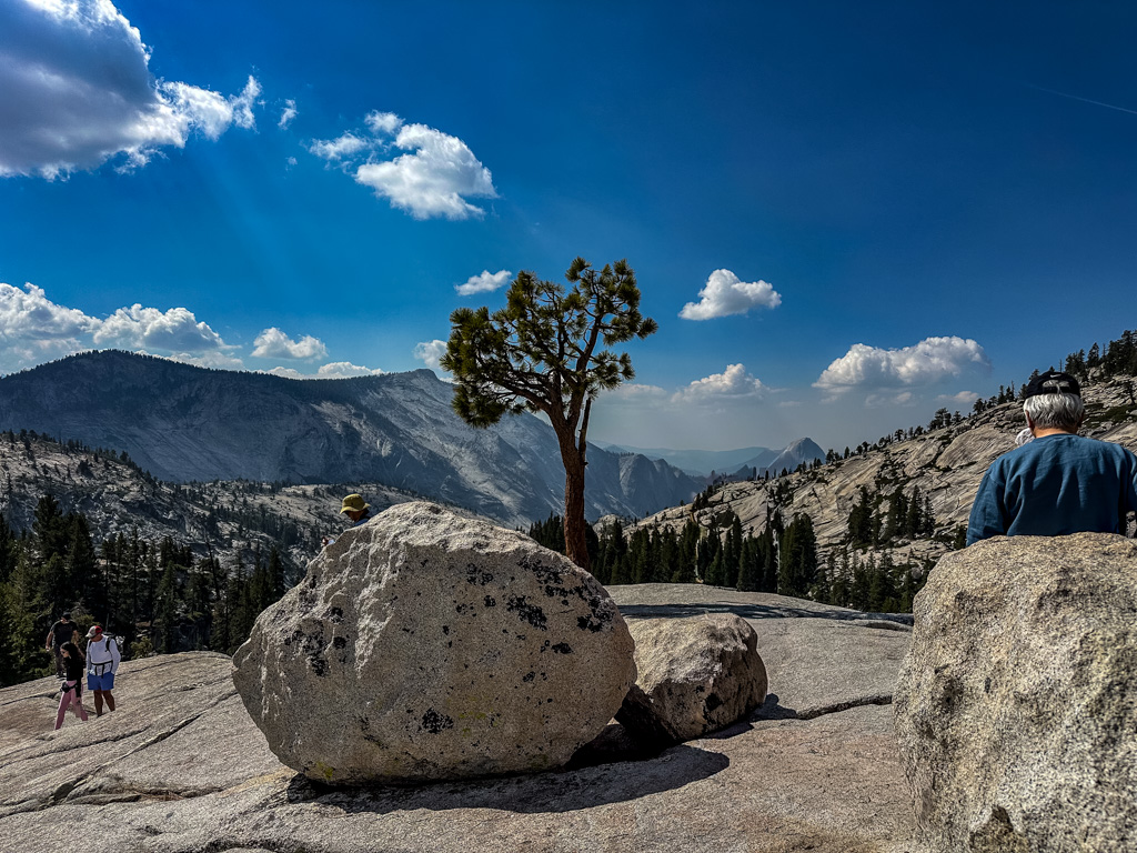 Yosemite ValleyからBOFロードを経由し、Crane FlatでTioga Passロードに入り45分ほど走ったところにOlmsted Pointがあります。氷河の削った花崗岩の石の上の展望台で、正面にHalf DomeとClouds Restを望むことができます。氷河の残した迷子石(Glacier Erratics)がそこかしこに残っています。