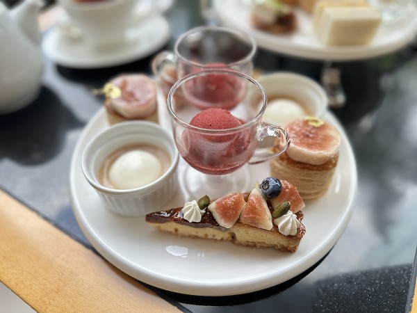 ・3段スタンドで提供:マスカットスイーツ・いちじくスイーツ・セイボリーのバランス
