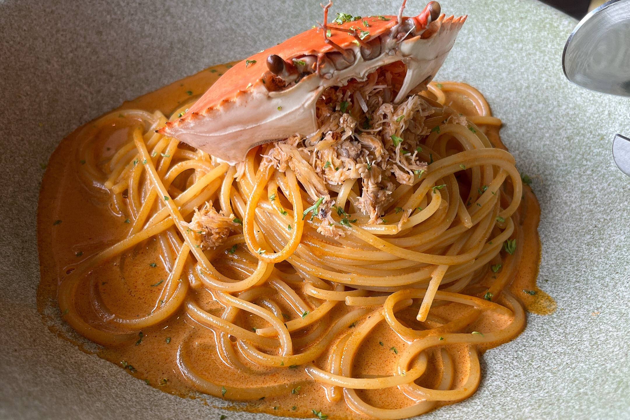写真のカニのパスタは、インドネシアのカリマンタン島に生息するカニを使ったパスタです。