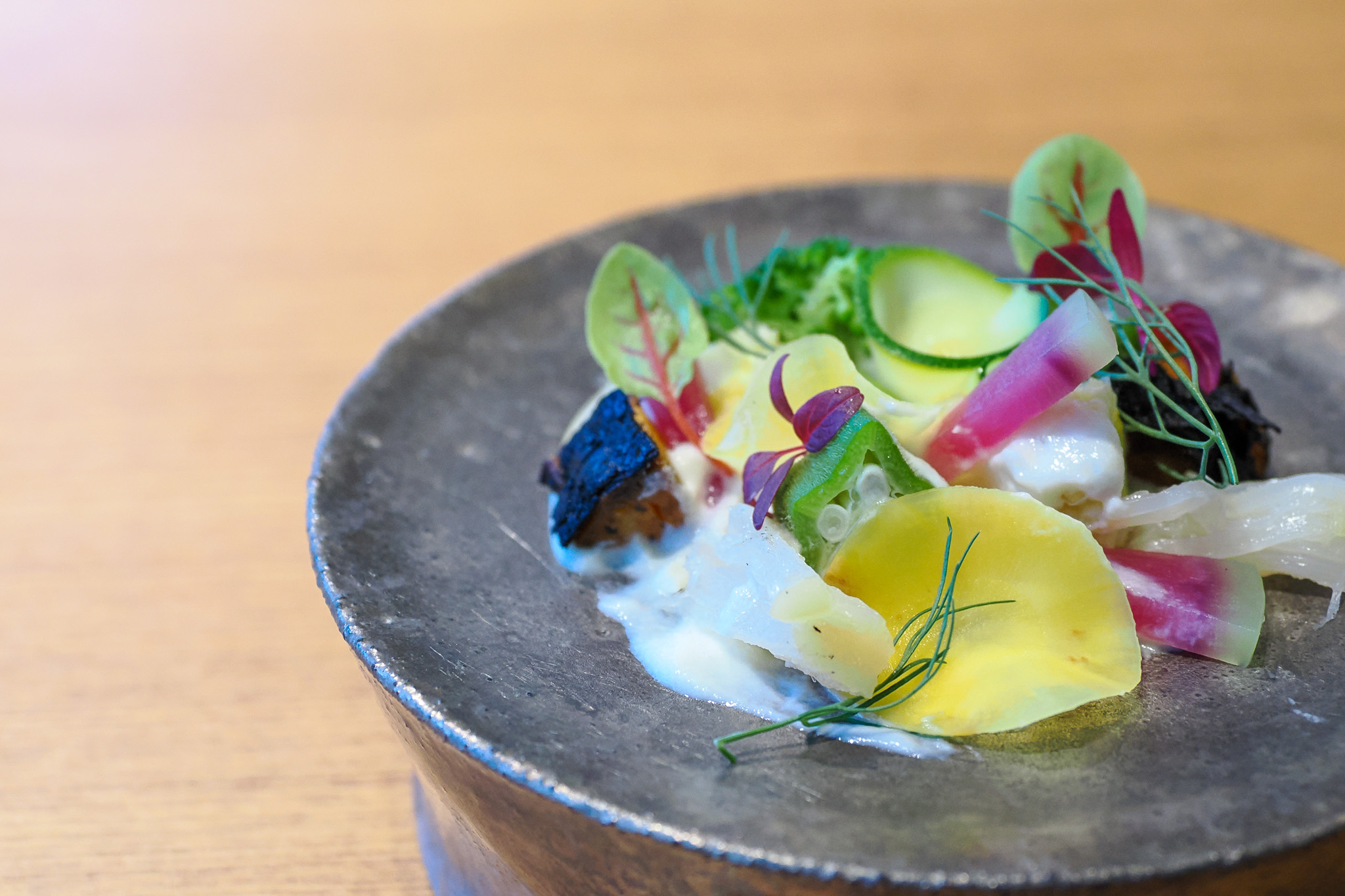 また、野菜をメインに噴火湾産ホタテの自家製スモークを散りばめた前菜。カリフラワーピューレのソースや、炭火人参の甘みにも感銘を受けました。