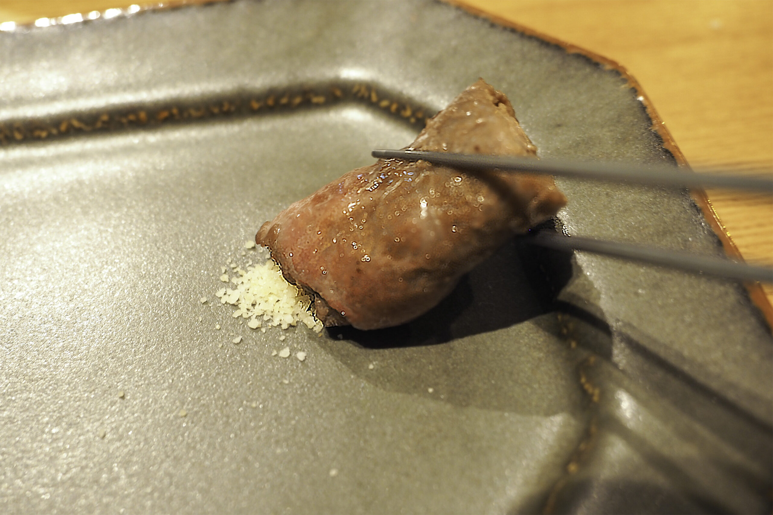 薄切り赤身肉は、タレで下味をつけて炭火焼きにし、シェフ厳選の塩で作るオリジナルのコンソメ塩、じゃがバター塩をつけて。