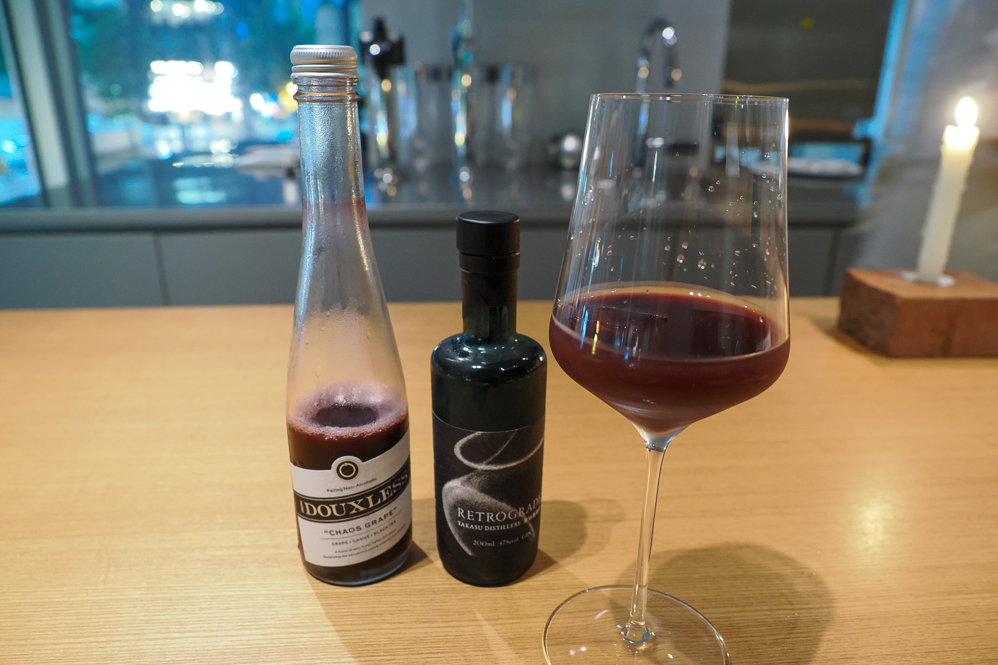 甘くないグレープジュースを使ったオリジナルカクテル、ジン・グレープソーダも鮮烈なおいしさで、このクールなカクテルは、鷹栖蒸溜所(北海道鷹栖町)のジンRETROGRADEを使用。