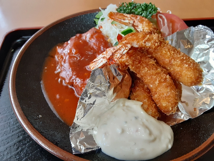 手造りハンガーグ&エビフライ定食 1,100円「どうぞ~、お待たせしました」と目の前に置かれてボリューム満点さに驚く!! 特に、ご飯の量たるやッ!! ぬぬっ、食べ切れるかな?! 小食の方は、食べ切れないと思いますけぇオーダー時に一言伝えるといいかも。