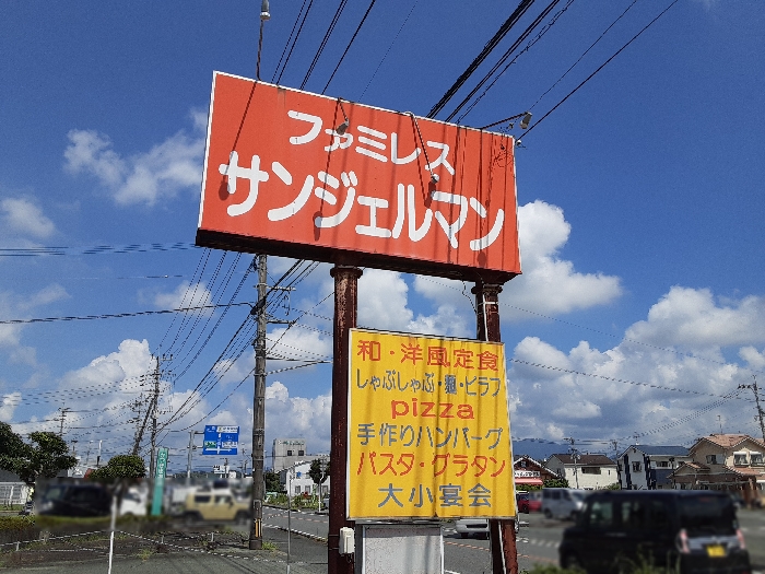 熊本県北部、菊池市国道325号線沿いにある老舗ファミリーレストラン「サンジェルマン」懐かしい昭和み感じる味わいある看板とフォント、そして、トリコロールカラーが印象的な建物がステキだなぁと気になっていました。店舗前に広めの駐車場があるので駐車しやすいと思いますが、交通量の多い通り沿いなので出入りの際は事故などにお気をつけください。