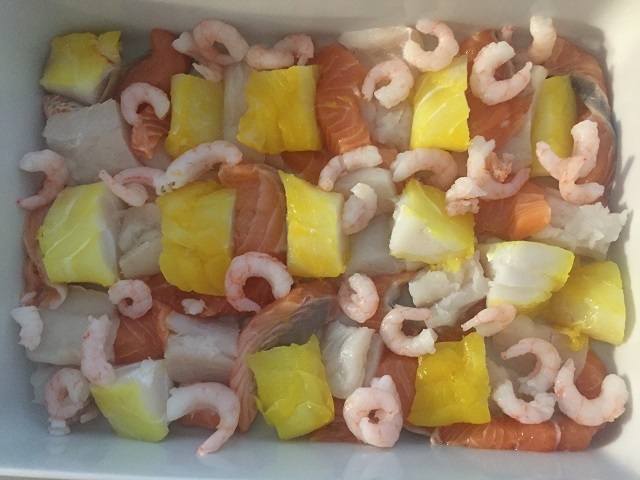 フィッシュパイの主材料は、じゃが芋と魚介類。じゃが芋はマッシュポテトに適したもの、そして魚介類は白身魚やサーモンや海老などが一般的です。