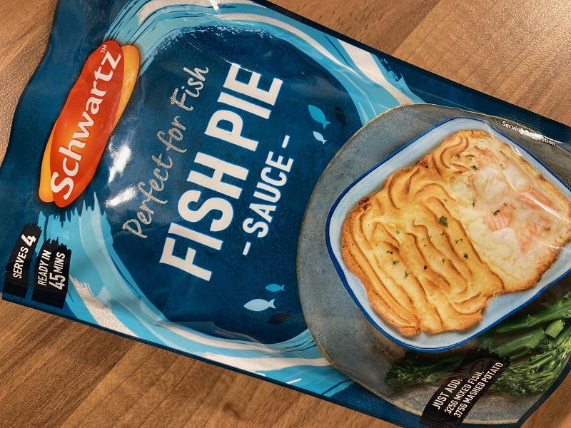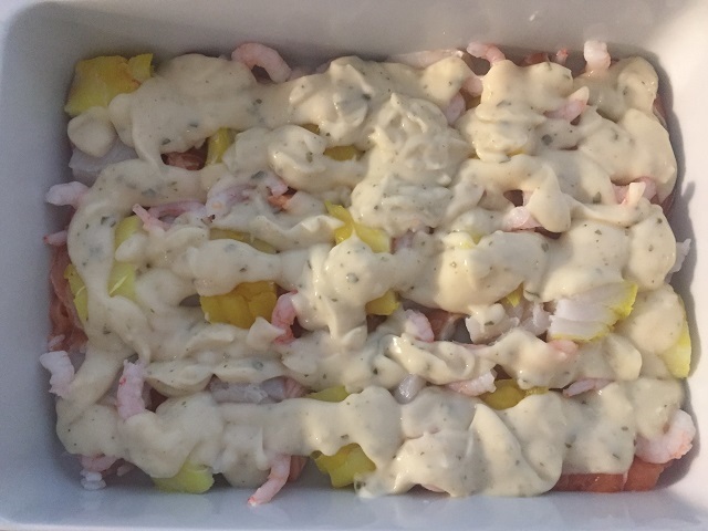 3)塩コショウしたベシャメルソース、または既成フィッシュパイソースで2)を覆う。なおイギリスでは既製フィッシュパイソースがスーパーで手軽に買え、すぐ使えるレトルトパック入りや、粉末状を熱湯で溶くものなど各種あります。