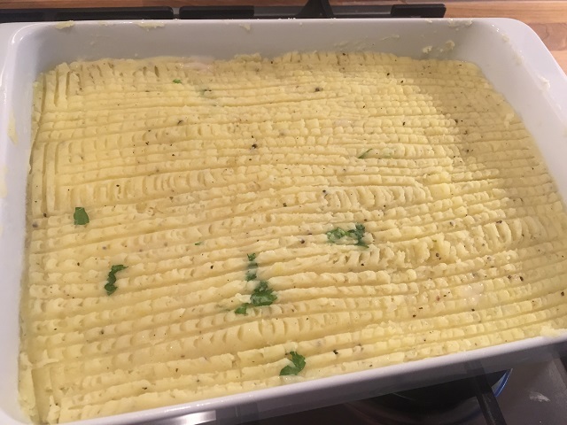5)マッシュポテトを4)の上に満遍なく被せる。フォークなどで波状の模様をつけておくとカリッと焼けて美味。