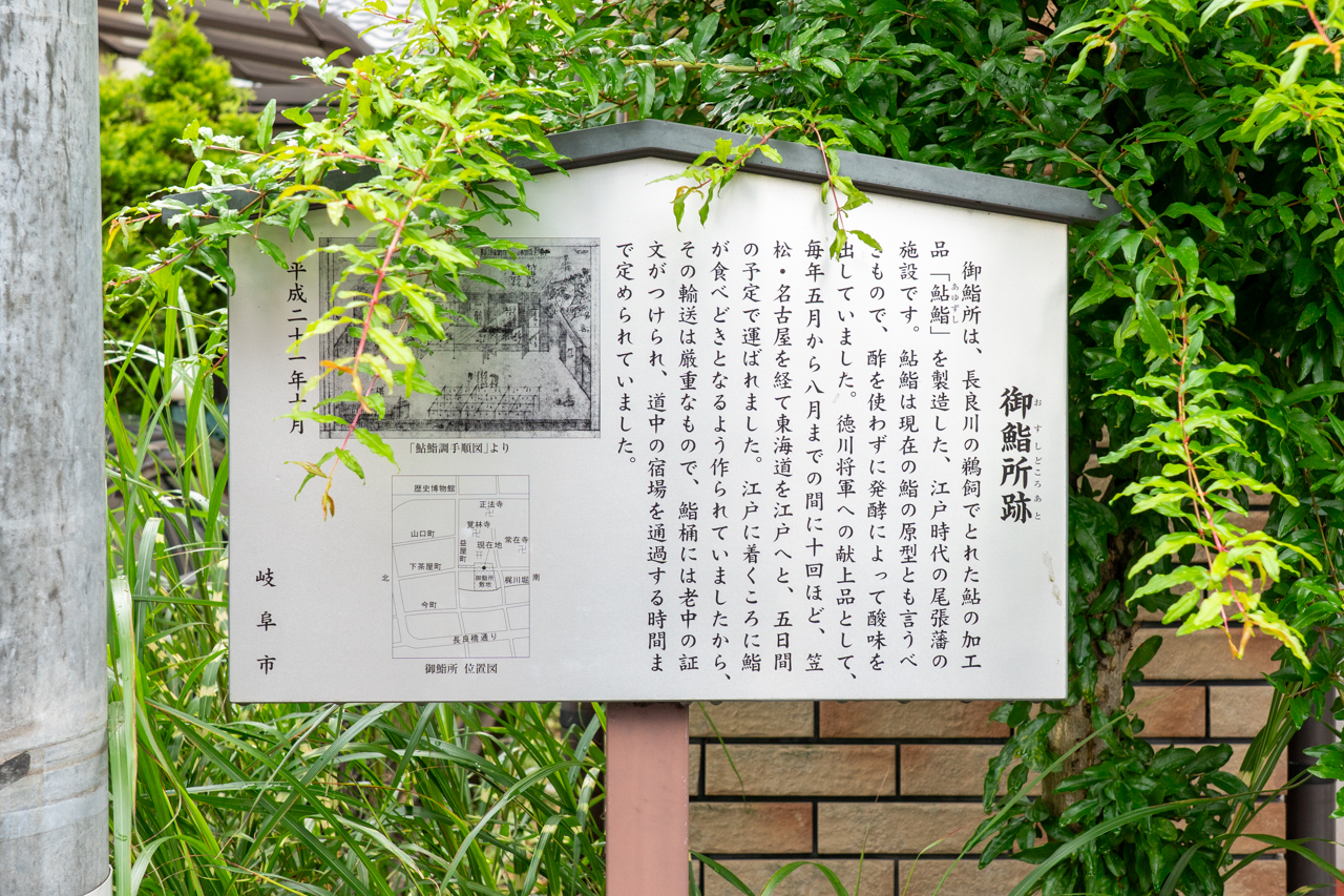 岐阜市を睥睨するように鎮座する金華山と岐阜城。その麓、岐阜大仏で有名な正法寺から西へ少し歩いた先に、「御鮨所跡」という岐阜市による案内板が立っています。案内板によると、同所は江戸時代の尾張藩の施設があった場所で、長良川の鵜飼でとれた鮎の加工品「鮎鮨(鮎熟れずし)」を製造していたそうです。
