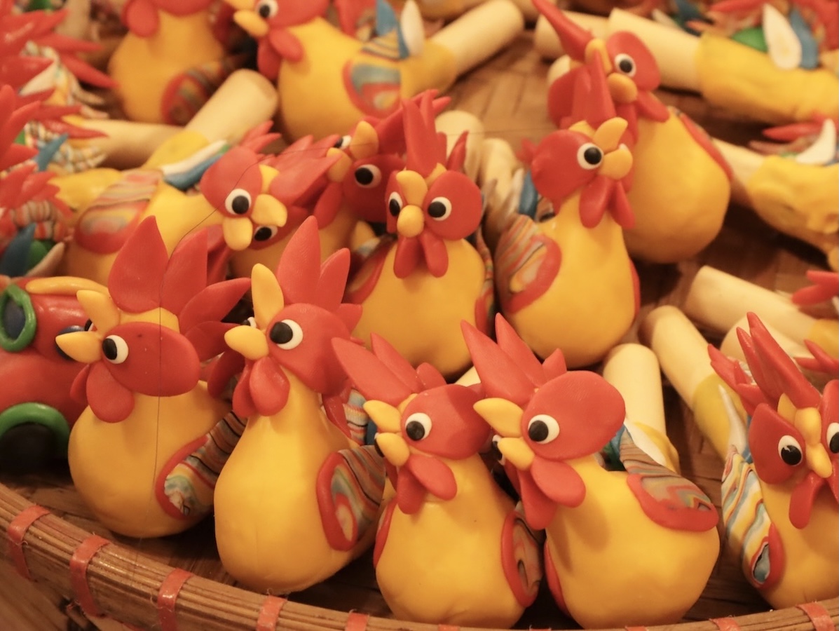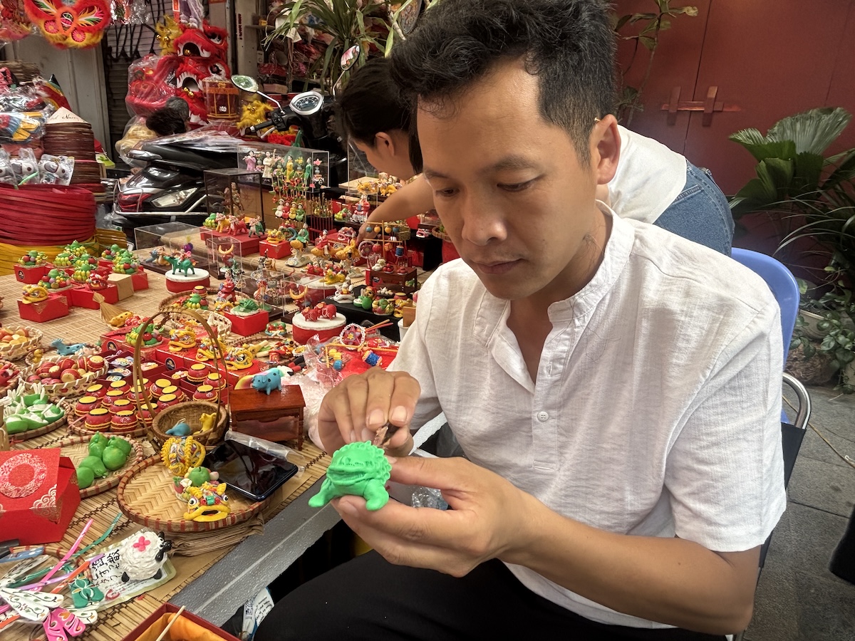 ハウさんはこの道20年、米粉を使ったミニチュアを作る職人さんです。この日並んでいたのは、中秋節の飾りや、月餅、獅子舞や中秋節に飾られる果物の盛り合わせなど。普段はこのあたりでお見かけすることがないハウさん。それもそのはず。販売は中秋節とテト(旧正月)の時期だけだそう。毎年新作も販売するそうですが、今年の1番人気は、鳥の竹笛。竹籠に並べられた鳥たちの表情がなんともユーモラス。あまりのかわいさに私も思わず購入してしまいました。
