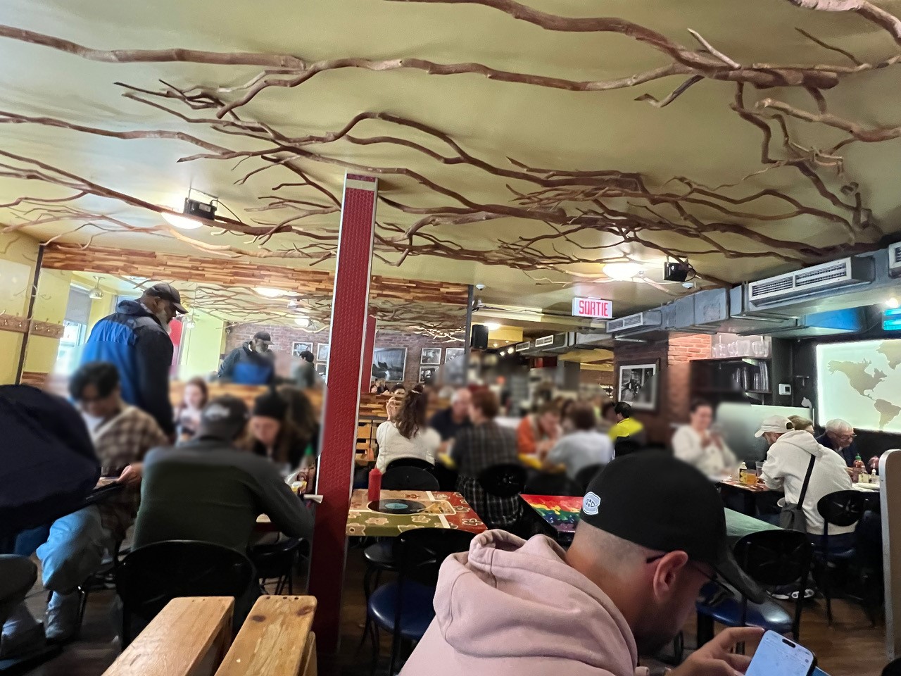 お店に入ると、お昼時を過ぎていたので幸いそれほど並ばずに入ることができました。入り口はテイクアウトの列とイートインに列に分かれていて、軽快なダンスミュージックが流れています。ポップな雰囲気の店内は手書きのイラストのカラフルなテーブルが印象的です。プティーンのメニューは35種類以上!選びきれないのでお店の方に人気メニューを聞いて「La Scooby」(ミンチ状の牛肉、ベーコン、玉ねぎ、フライドピクルス)と「La Sud-Quest」(ベーコン、オニオンリング、ワカモレ)を注文しました。標準サイズと大盛りがあるのですが、標準サイズでもかなりのボリューム!筆者が注文したLa Scoobyは最高でした。チーズとグレイビーとフライドポテトが奇跡のハーモニー。他店で食べたプティーンと比べてチーズの大きさや触感、グレイビーソースの濃さがとてもちょうどよく、フライドポテトに合う!そしてトッピングのお肉がほどよい触感と香ばしさでプティーンにアクセントをつけてくれています。更に、ピクルスのフライなんてどんな味がするのか想像ができませんでしたが、ちょうどよい酸っぱさがなんとも美味。例えるなら天ぷらのような感じでしょうか。気持ちとしては無限に食べられるくらいおいしいです。とはいえ、お皿いっぱいのジャガイモですので、現実は標準サイズでも完食ならずでした。美味しいのにもう食べられない自分の小さな胃袋を思ってふがいない気持ちになりましたが、お持ち帰りもできるので、食べきれない場合は店員さんにお願いしてボックスをもらうとよいでしょう。
