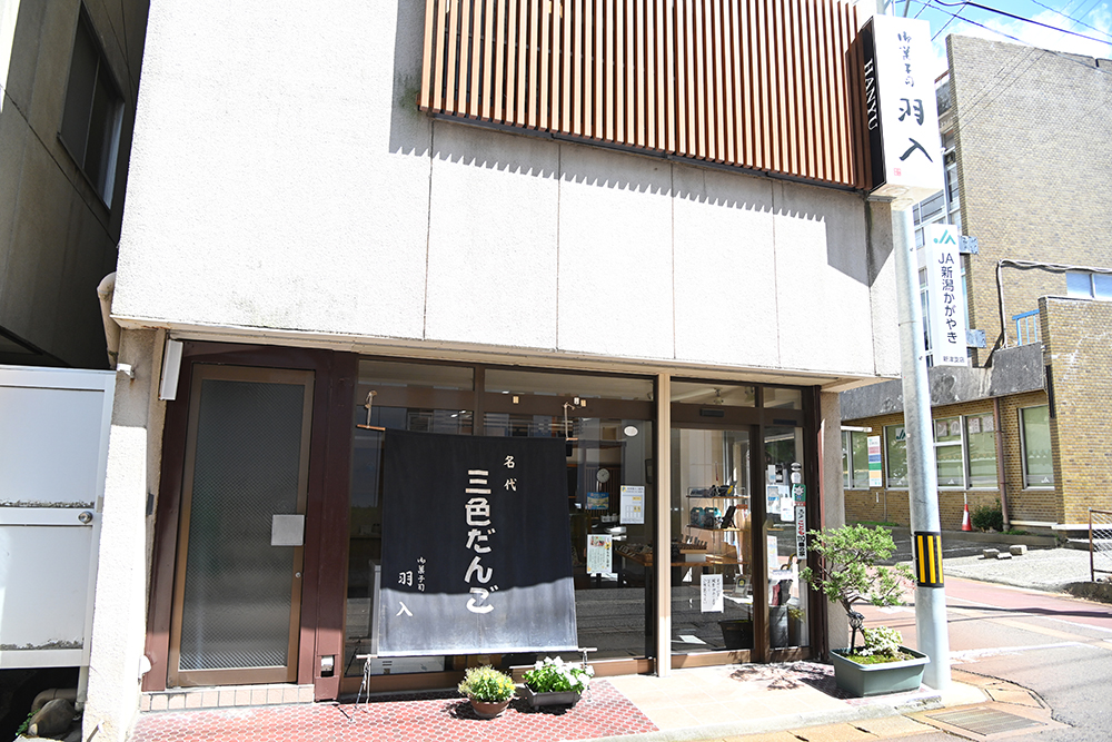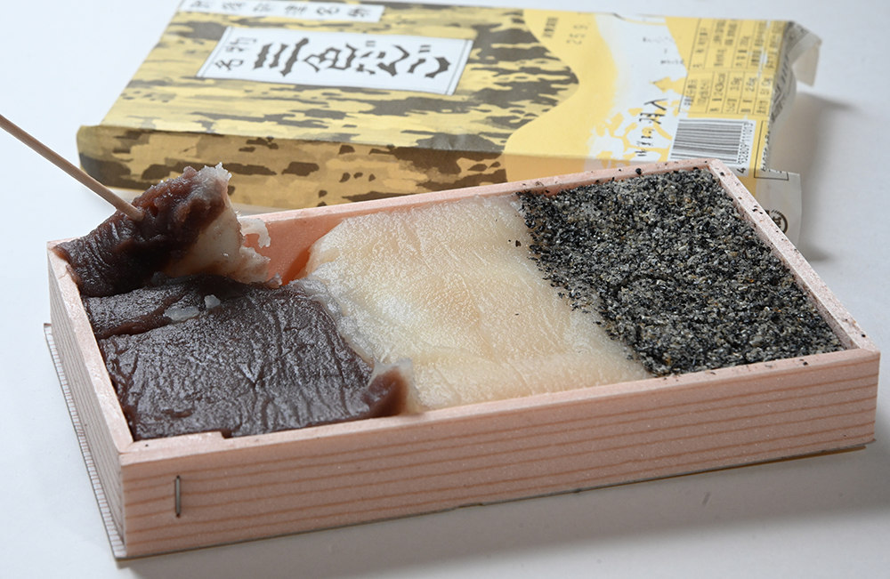 お腹もいっぱいになったので、おみやげに「三色団子」を製造・販売している「御菓子司 羽入」へ。「団子」というと串に刺さったものを想像するかもしれませんが、三色団子は駅弁を思わせる箱の中に団子が24粒ぎっしり詰まっており、こしあん、白あん、ごまがその上を覆っているのが特徴です。