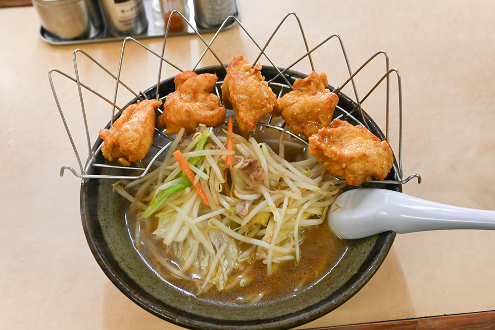 商店街の展示を楽しく見ていたらお腹がすいたので知人に勧められた「大将ラーメン」へ、名物の「大将スタミナみそラーメン(1210円 税込み)」を注文。待つこと数分「お待ちどうさま!」の声とともに運ばれてきたのは、5個のから揚げが金属の“ざる”に乗っているユニークなどんぶりに入った熱々のラーメン。から揚げは新潟県民にはおなじみのカレー味です。普通盛りですが野菜も入っていてかなりの量があります。