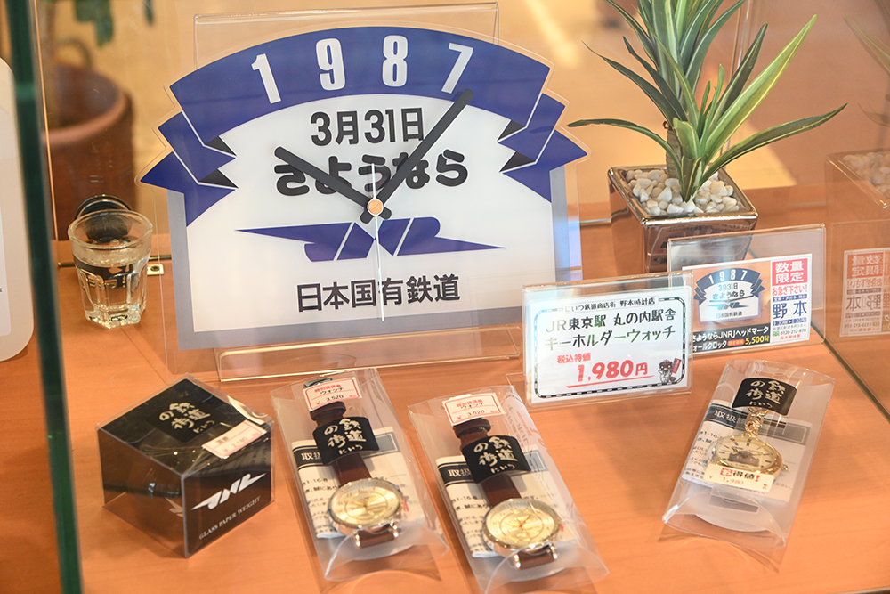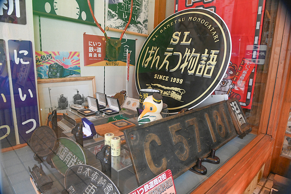 そのまま歩くとお店のショーウインドーに「SLばんえつ物語」と書いてある蒸気機関車の先頭に掲げるヘッドマークや「C57 181」というプレート、さらにはいろいろな鉄道関連の用品が並んでいます。看板を見ると「きもの処 むらき」―着物屋さんのようです。お店に入ってショーウインドーのことをたずねると「この商店街全体が、鉄道資料館の“分館”なんです」と店主の村木政寛さん。なるほどほかのお店を見ても鉄道関連の展示がありました。