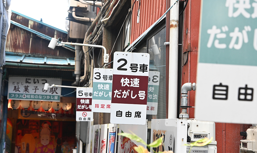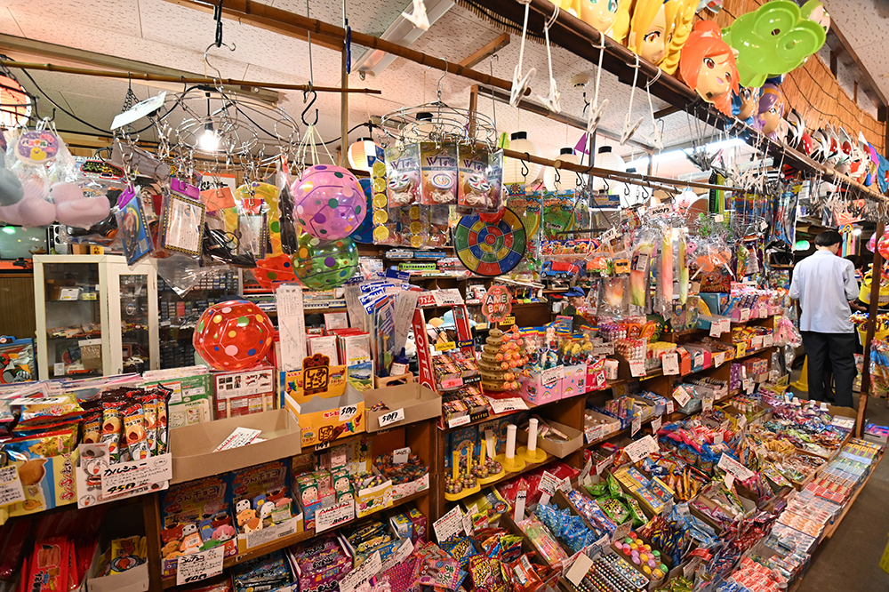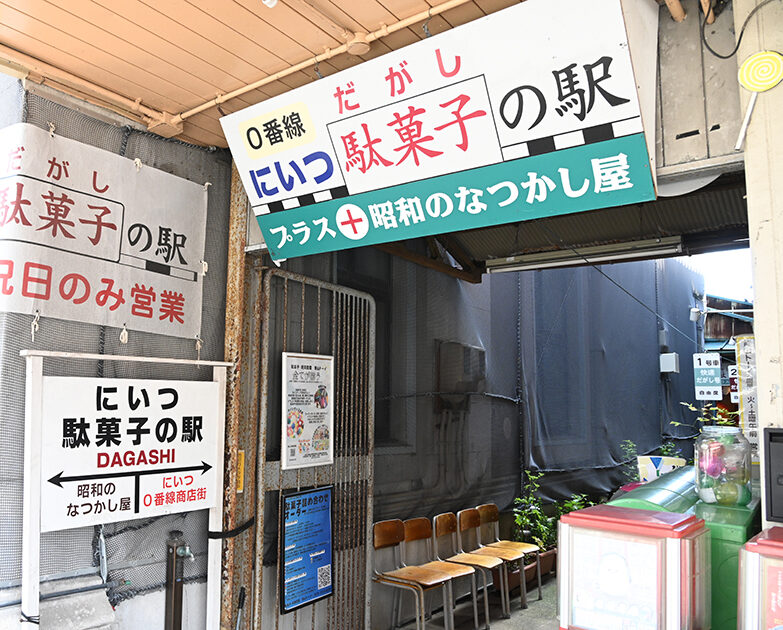 先へ進むと「にいつ駄菓子の駅」と書かれた鉄道の駅風の看板を発見。路地のような入り口には、昭和の駅にあった「○号車 指定席」みたいなブリキの表示板が下がっていてワクワク感が高まります。お店はまさに「昭和」そのもの!小さなころに買ったあのお菓子やこのおもちゃが店内にあふれています。大人買いをしたくなるのは私だけではないはず(笑)。