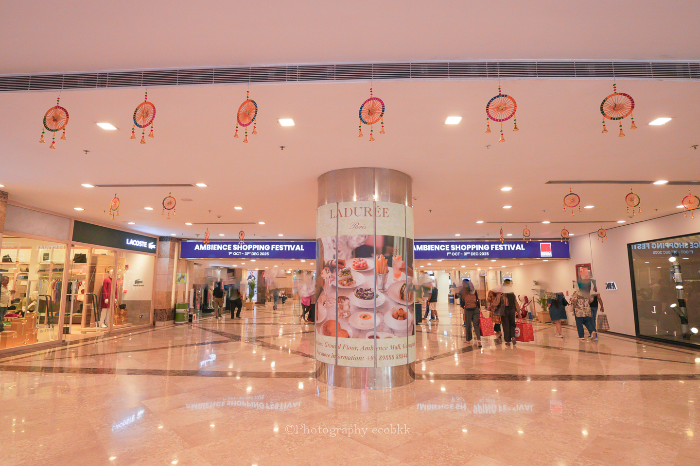 今回、初めて、グルグラム(グルガオン)で最も有名な高級ショッピングモール「アンビエンスモール(Ambience mall)」に行ってみましたが、ラルフローレンやユニクロ、スワロフスキー、PAULやクリスピードーナッツ、サブウェイやマクドナルド等、日本人に馴染みのあるファッションブランドや飲食店もたくさん入っていて、子どもたちが遊べるスペースもありました。それでいて、地下にはローカル感のあふれる庶民的なスーパーが入っていて、楽しいスポットでした。アンビエンスモールのDiwaliお祝いのモニュメント前ではたくさんの人がポートレートを撮っていました(ただ、アンビエンスモールでは、デジタル一眼カメラでの撮影は基本的に禁止されているようでした)。