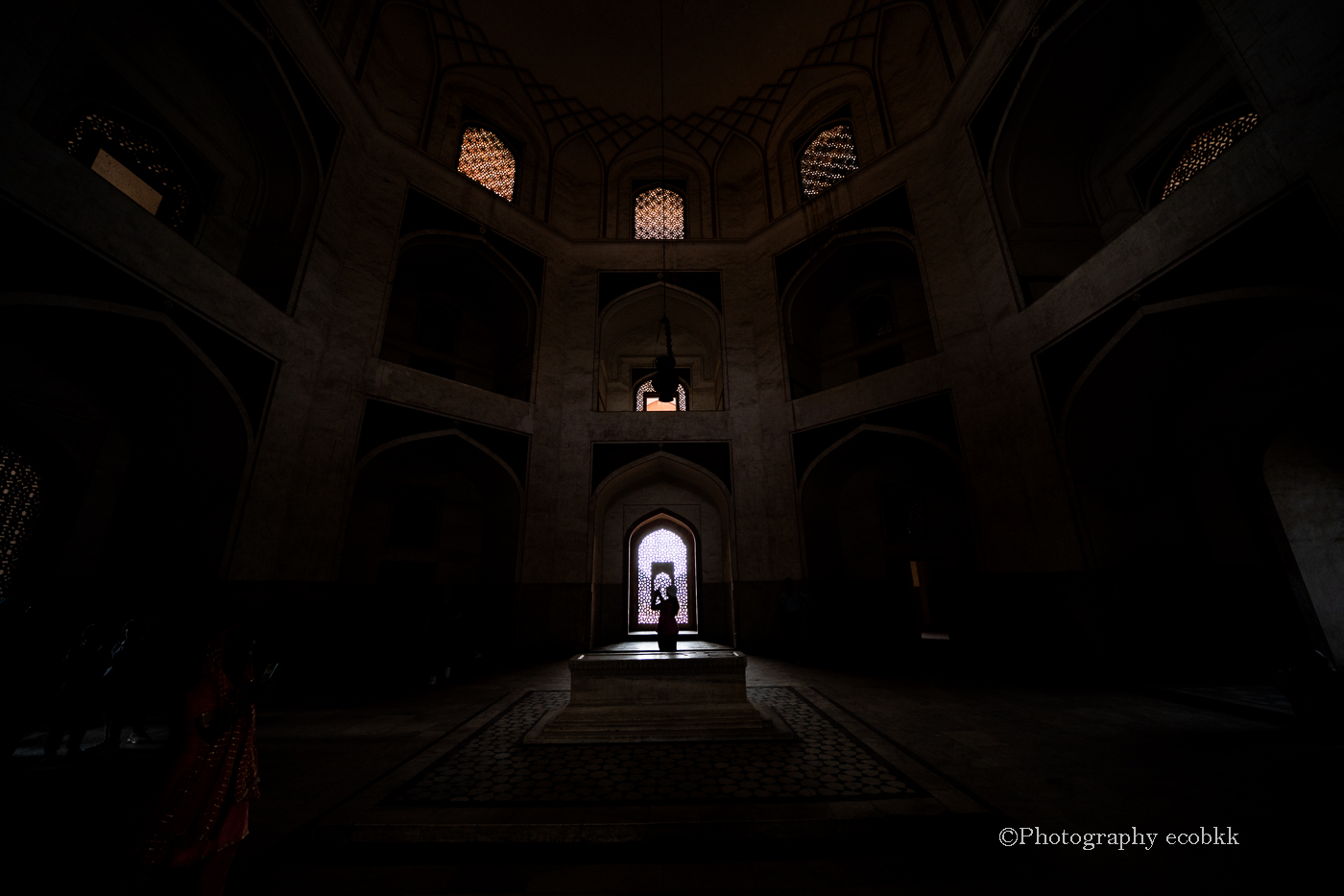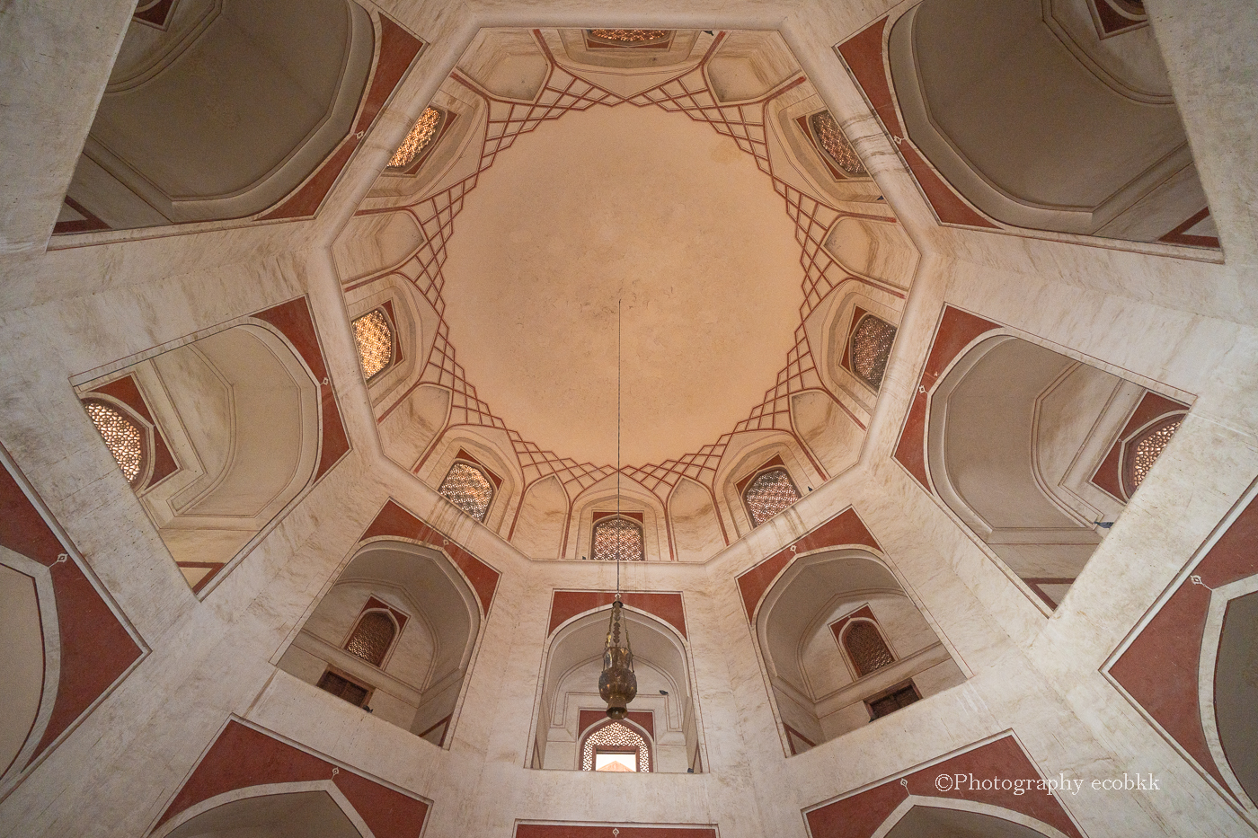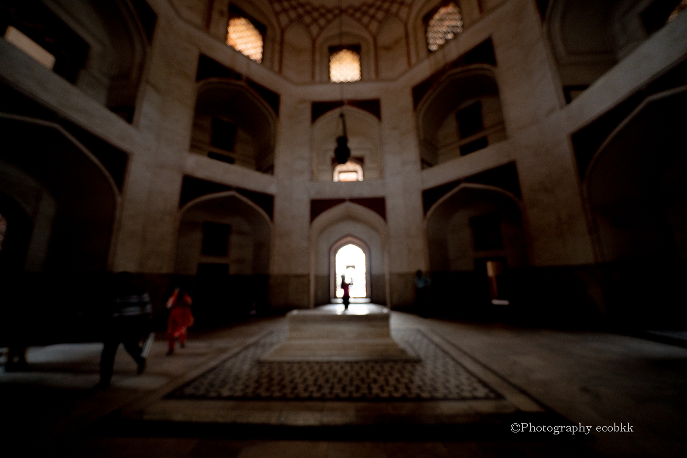 中央にドームのあるフマユーン廟の左右対称の建築は、特に美しく、息をのみました。さらに、上にのぼることができ、上から入口等360度見渡すことができます。そこには、フマーユーン、王妃ベーグム、王子ダーラー・シコー、そして、重きをなしたムガル朝の宮廷人たちの遺体、計150人の死者が埋葬されているのだそう。中央にある白い大理石の石棺はフマユーンの仮の墓で、遺体はこの下に安置されているのだそう。