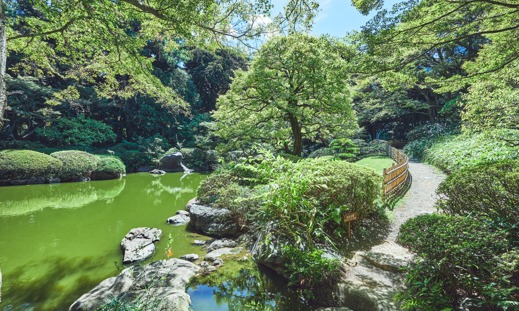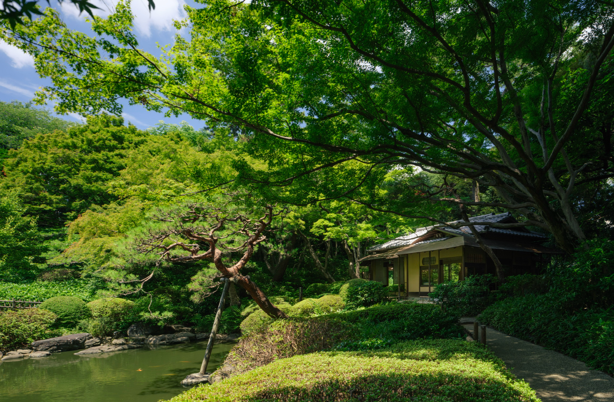 池や築山、流れる水の音が加わる日本庭園エリアは、東京都心とは思えない静けさを湛えています。一方で西洋庭園 芝庭は、幾何学的に整えられた芝生や植栽が洋館の美しい外観を引き立て、ふたつの異なる雰囲気を楽しめます。