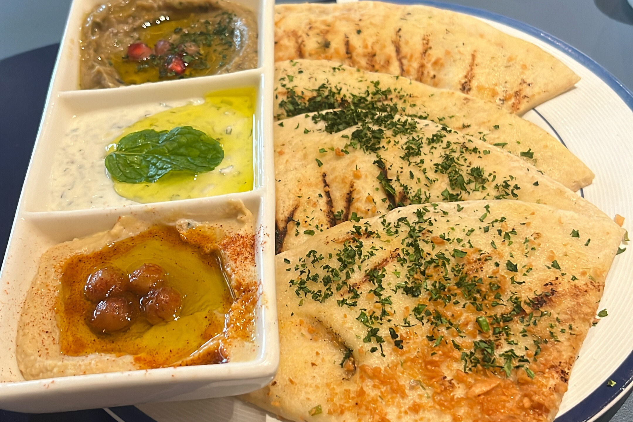 ソースプラッターを頼むと、ひよこ豆などをペースト状にしたフムス、ナスやゴマなどをペーストにしたババガヌーシュ、ギリシャの伝統的なソースであるヨーグルトベースのザジキが楽しめます。ピタパンにソースを付けて食べると、食事もワインも進む美味しさです。
