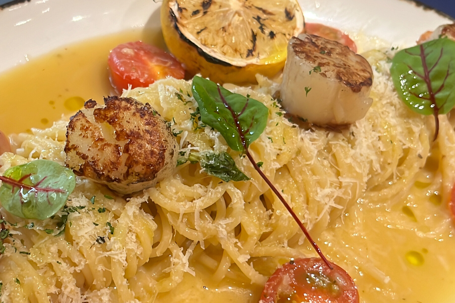 充実するパスタメニューのなかから選んだ「ホタテのパスタ(Yialos Scallop Pasta)」は、ごろっとしたホタテが魅力的なパスタです。ガーリックバターソースが絶妙で、添えられたレモンもさわやかな風味を与えてくれるのであっという間に食べ終わってしまいます。