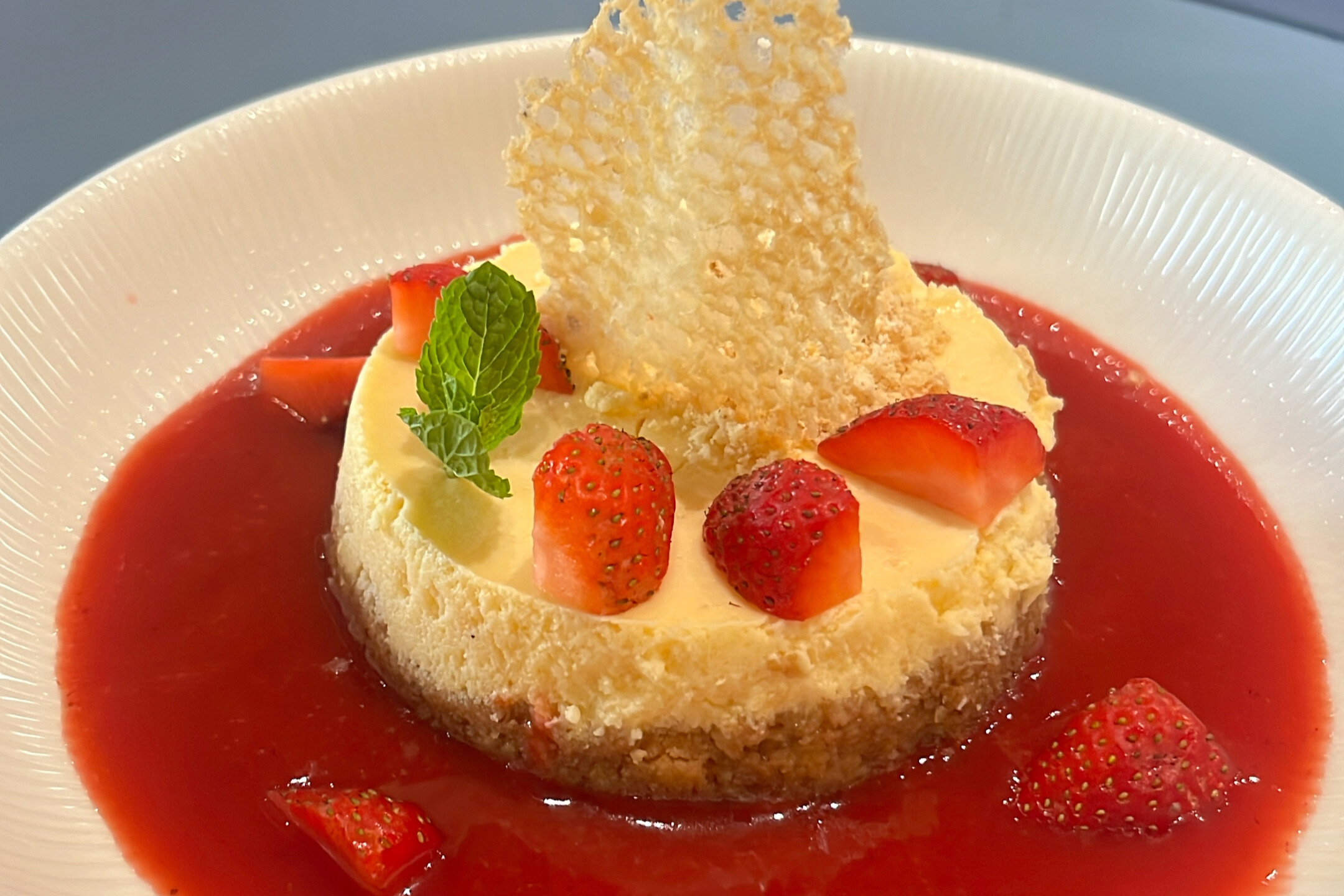 写真の「チーズケーキ(Yialos Cheesecake)」は、ギリシャヨーグルトを使用したチーズケーキで濃厚でありながら重くなりすぎない甘みがほどよいデザートです。イチゴのコンポートの甘酸っぱさもこちらのチーズケーキによく合っています。