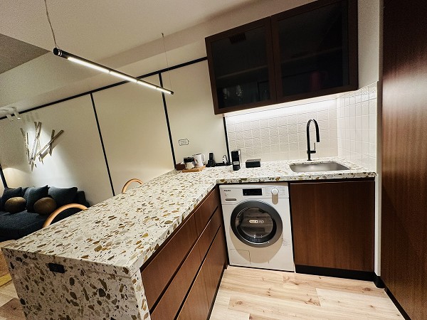 スイートルームには、洗濯乾燥機やミニキッチン、電子レンジも備わっており、長期滞在にも快適です。