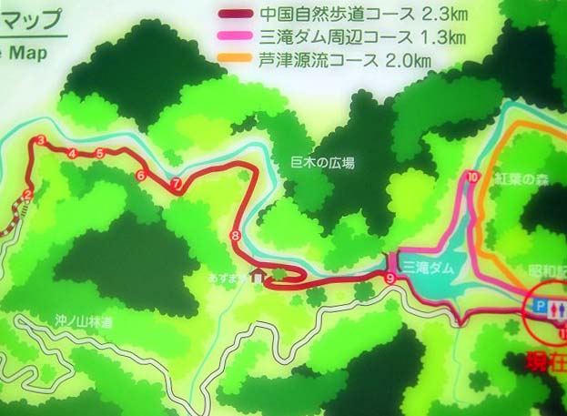散策道のマップがありました。三滝ダムコース以外にも「中国自然歩道コース」「芦津渓谷コース」の遊歩道があるようです。