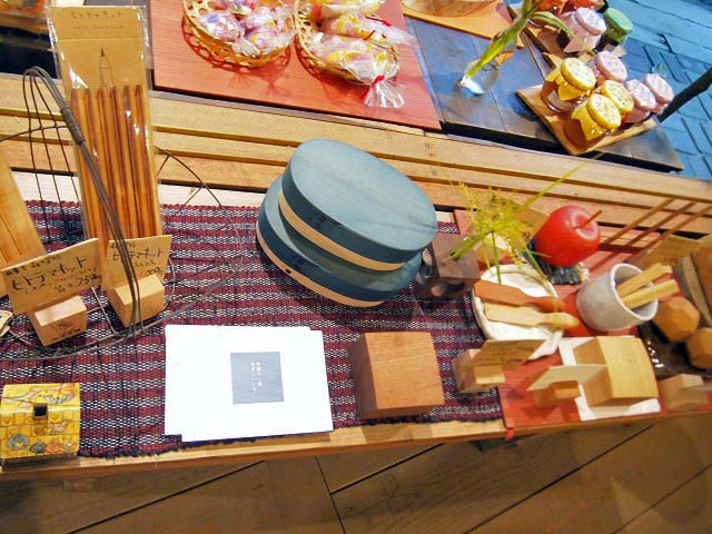 カフェの中には杉を使ったクラフトも置いてありました。蓋が緑に着色されたお弁当箱、生地のままだったら欲しかったなぁ。