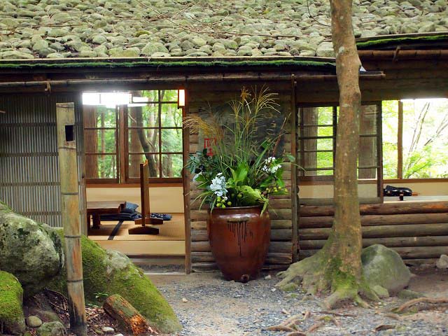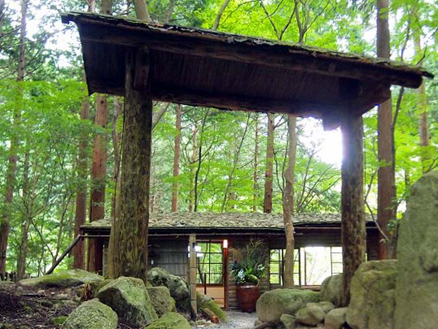 滝から川沿いを歩くと小さなカフェがあります。「小鳥のcafe Quince(クインス)」と看板がかかっていました。ここも「みたき園」の敷地の中のようです。川沿いには水車や川床が並んでいました。