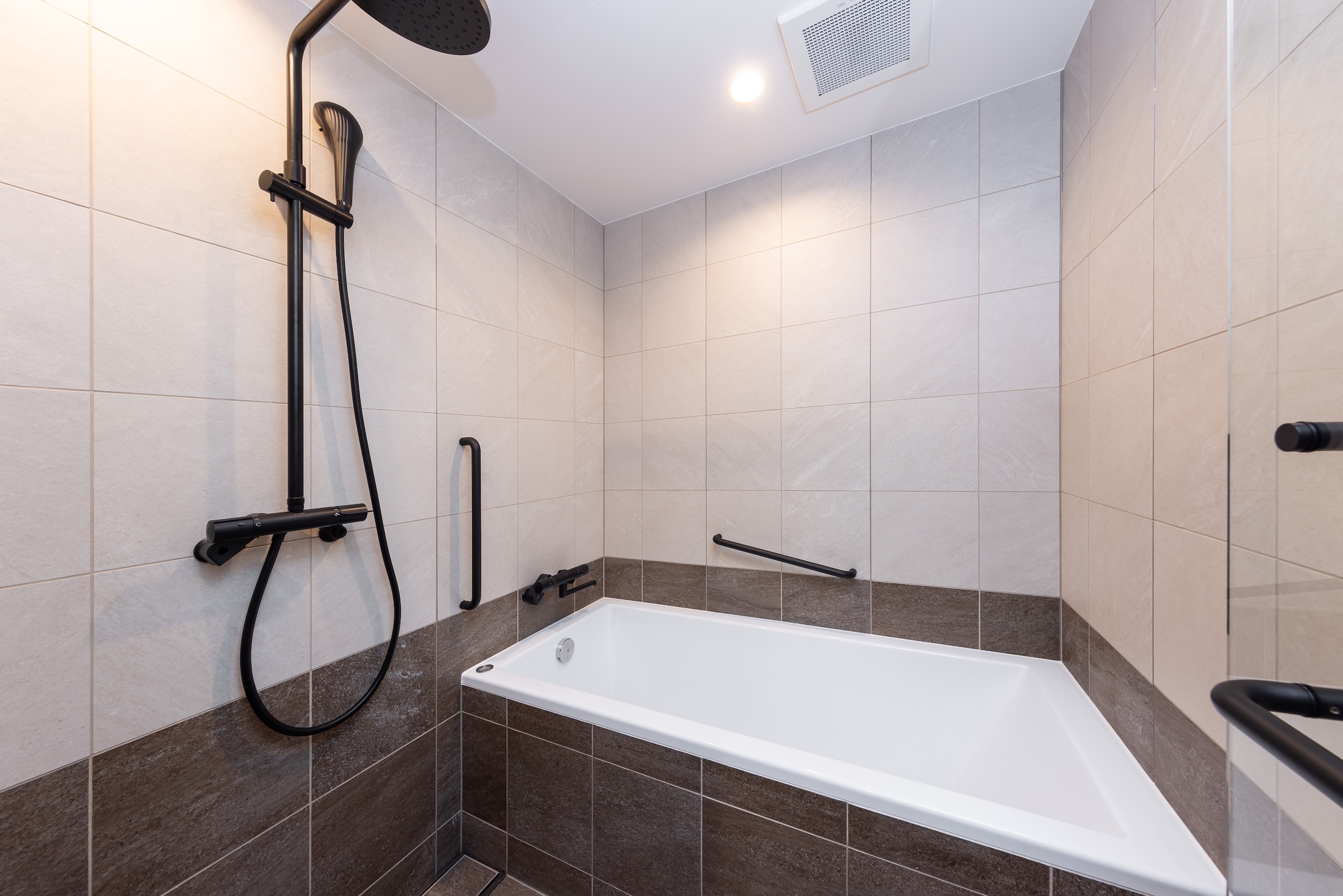 客室は、時間の流れをゆったりと感じられる落ち着いた空間でした。長期滞在したくなるような設備とアクセスのよさがポイントです。ゆったりとしたバスタブや京都を感じるアメニティも充実していました。