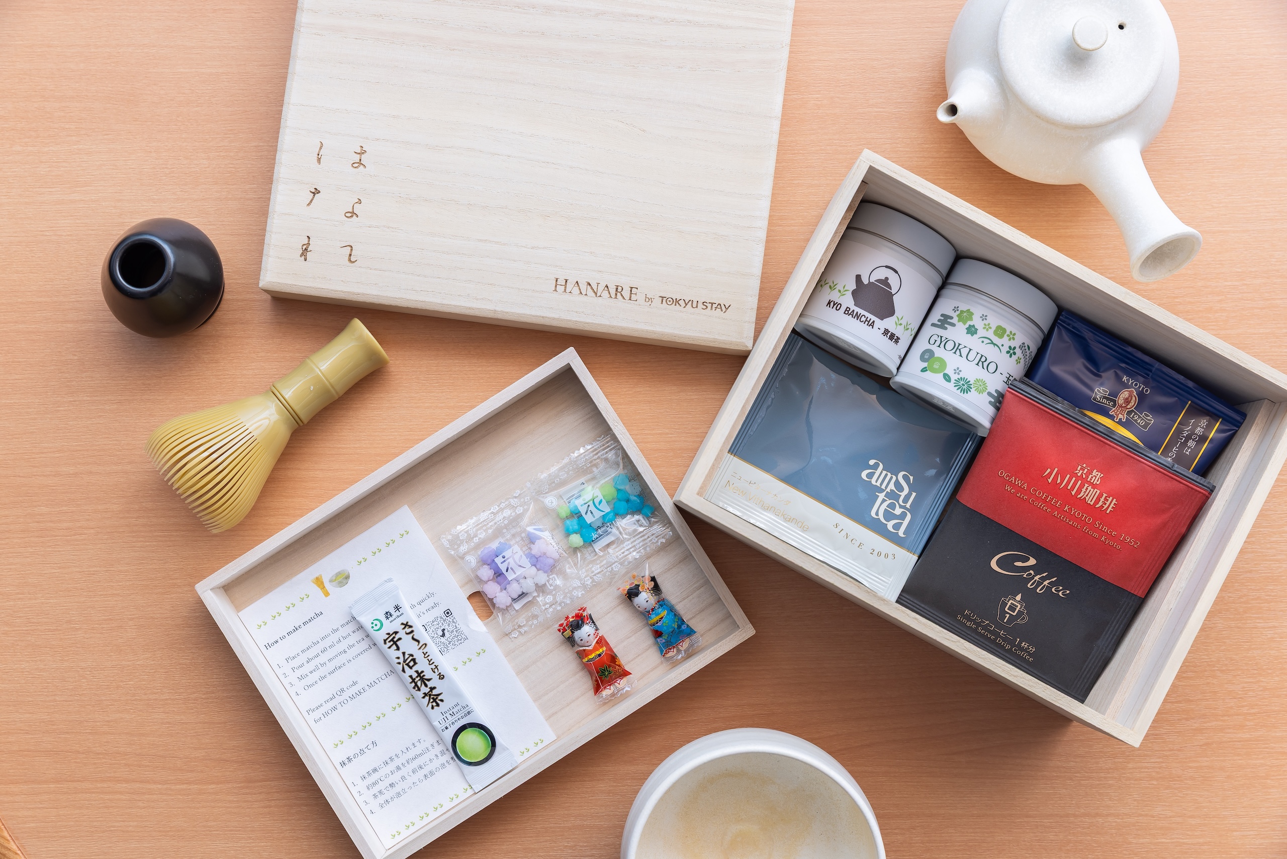 客室に用意されたアメニティも京都らしい、抹茶や京都茶にあられなど、日本人だけでなく、海外から来た観光客も嬉しいことでしょう!
