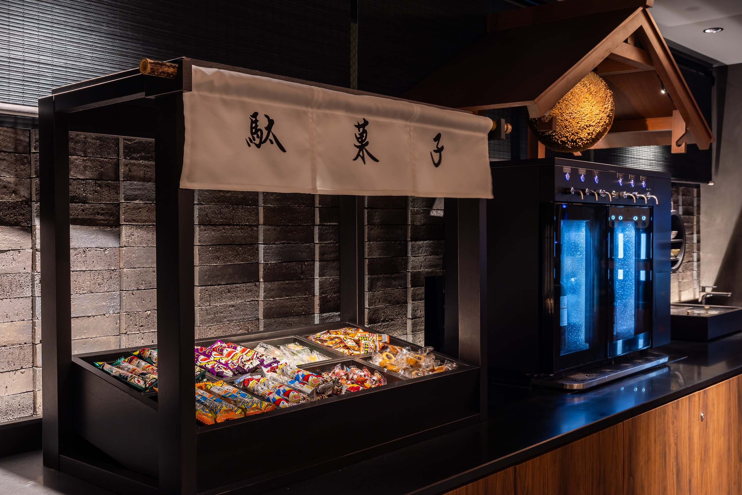ロビーには宿泊客のための駄菓子コーナーや美しいお猪口で楽しむ利き酒のコーナーもありました。飲み物も美味しいココアや、コーヒーなどが楽しめます!