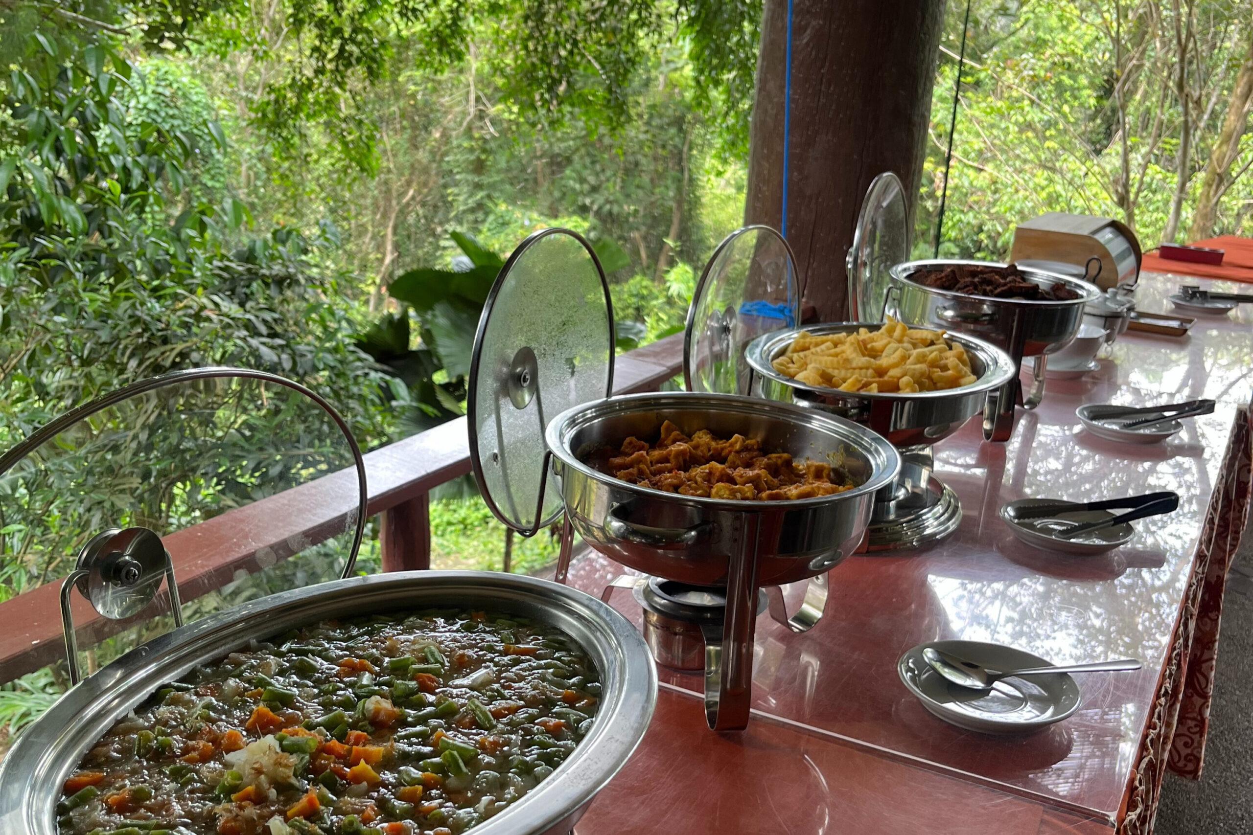 食事は、食事会場に時間になるといくつか料理が用意され、自分で好きなものを選んで食べる形式です。ビュッフェというほど種類は多くありませんが、充分な量が提供されます。朝食は無料で付いてきますが、ランチとディナーは追加注文することで食べることができます。食事の時間以外にも、コーヒーや紅茶は常に会場に用意されているため、好きな時間に来て森を眺めながら休憩することができます。