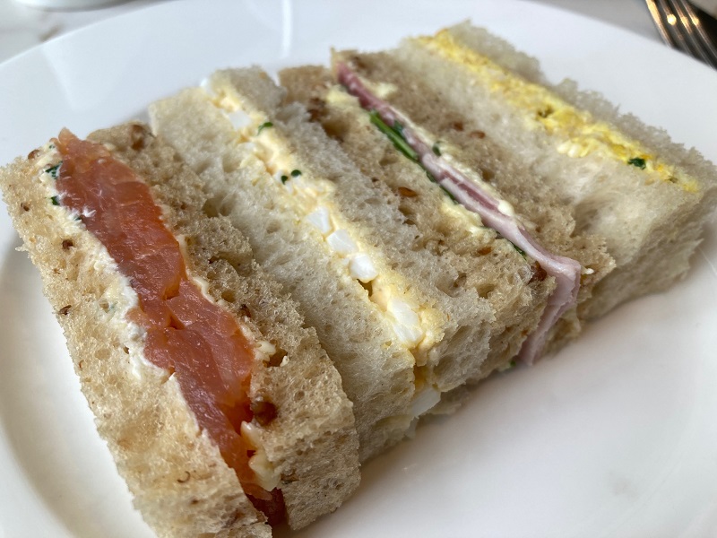 フィンガーサンドウィッチも定番フィリングのスモークサーモン&クリームチーズ、ハム&マスタード、卵マヨ、コロネーションチキンなのですが、しっとり感のある薄切りパンとのバランスが絶妙。またサンドウィッチは1回、お代わりも出来ます。