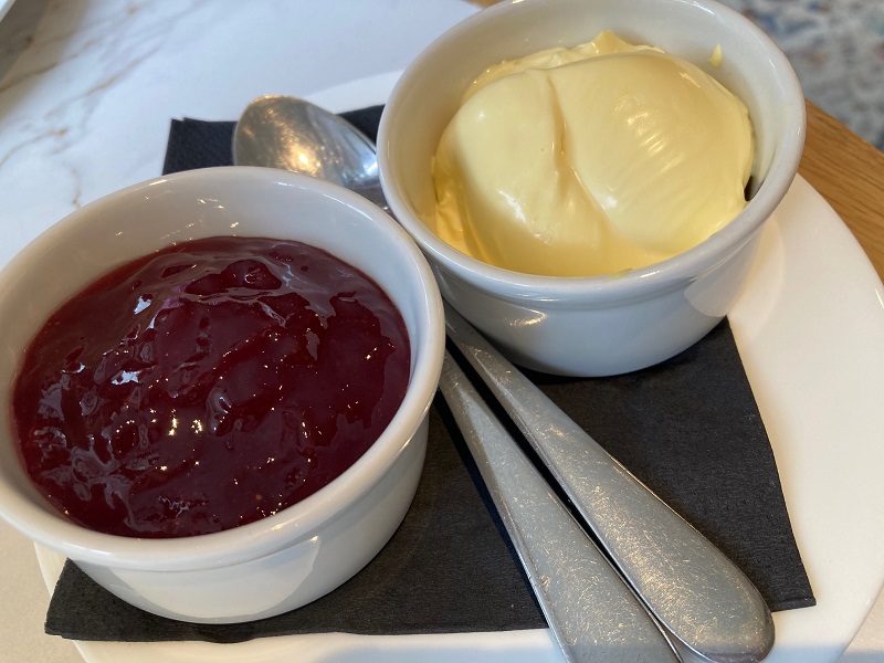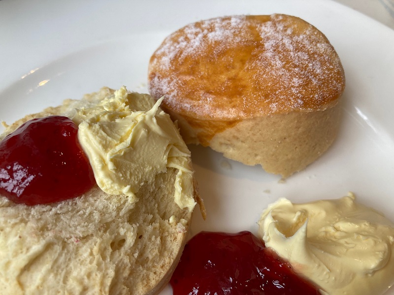 スコーンは小ぶりなプレーンタイプ。さく・ふわ食感の優しいスコーンは、やや黄色味がかったバース近郊アイビーハウス農場(Ivy House Farm)と苺のプレザーブとの相性抜群。