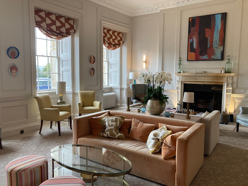 クレッセント全体の美観を損なわないよう配慮されたホテル外観は、遠目にはホテルを分からないくらい。通常のホテルで掲げられるイギリス国旗や紋章旗もなく、近くに行って控えめな看板を見てようやくここがホテルなのだと確認できます。
