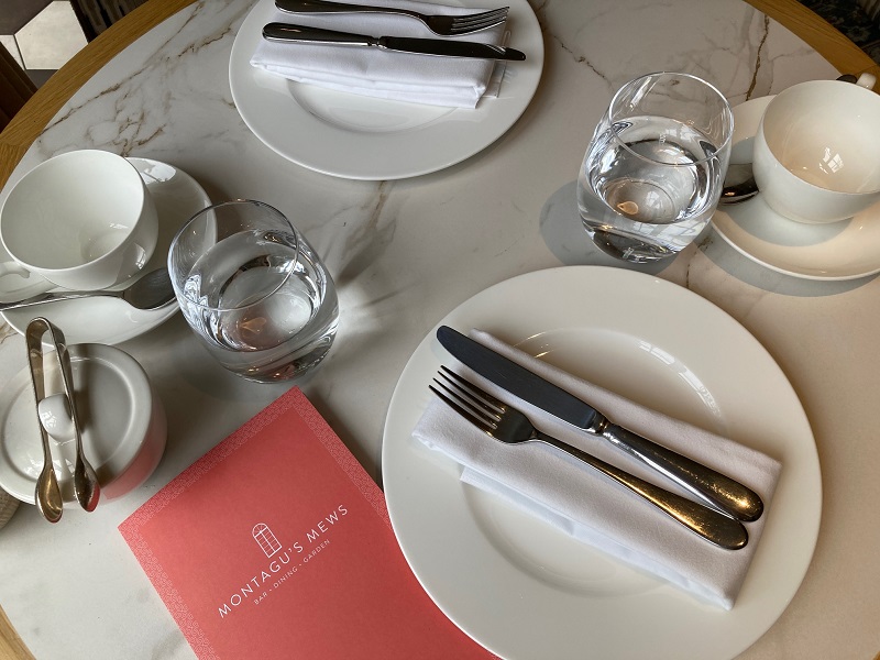 季節によっては外のテーブルが賑わいそうな中庭を眺めながら歩いていくと、スパ&プールとレストランが見えてきます。レストランの名前は「モンタギューズ・ミューズ」。