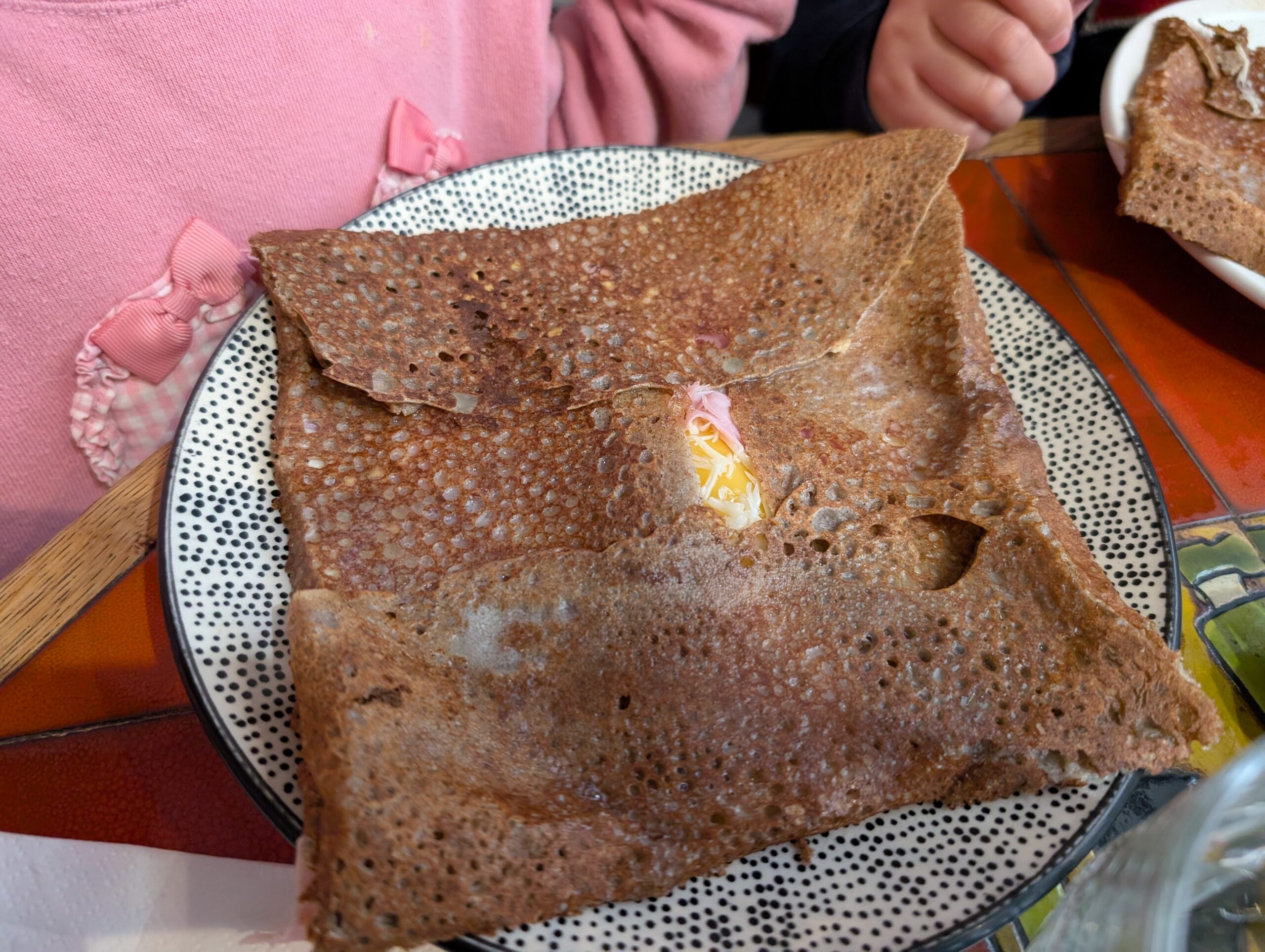 おすすめは「ガレット Ti Nevez」。ハムと卵、チーズというシンプルな組み合わせながら、生地の香ばしさと具材の塩気が絶妙に調和しています。これは普通のガレットより上質なものを使っているので、値段は少しだけ上がりますが、食べて比べてみたら味の違いは歴然。ぜひこっちを選んでみて。