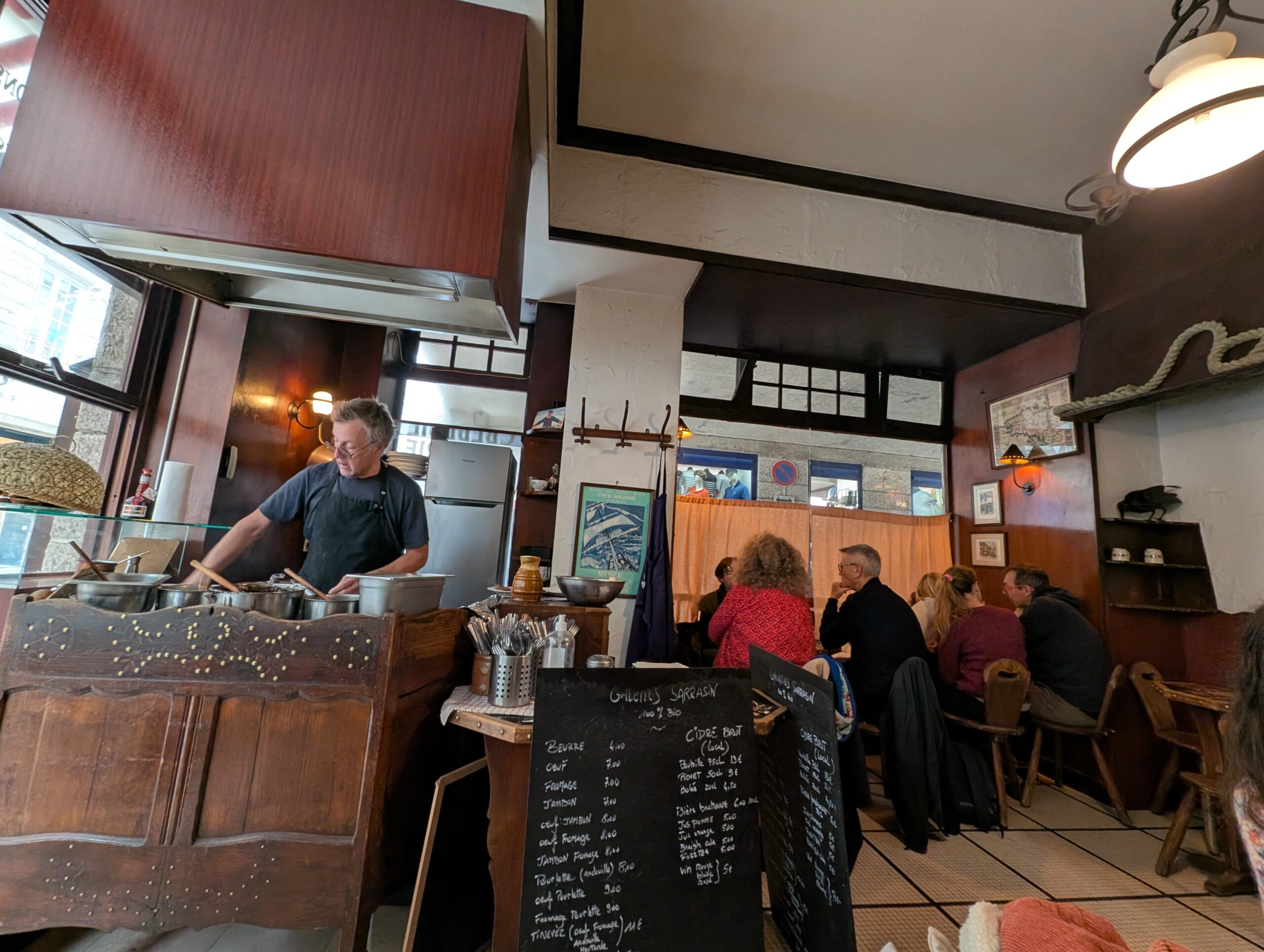 旧市街の石畳を歩いていると、ふと香ばしいバターの匂いが漂ってきます。その先にあるのが、小さなクレープ屋「Ti Nevez(ティ・ヌヴェズ)」。観光客でにぎわう通りにあり、外観は控えめですが、中に入ると鉄板の上でクレープが焼かれる音が心地よく響きます。
