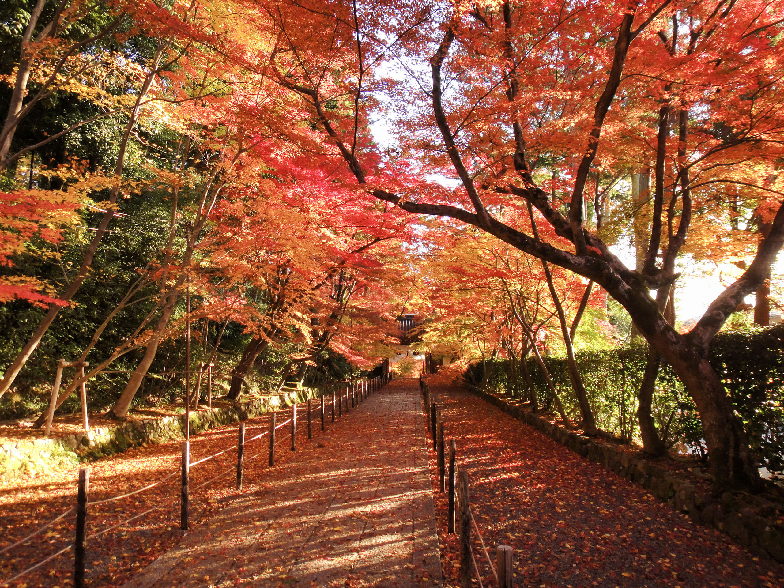 堂内の拝観出口を出て、総門へ向かう道中にあるのが「もみじ参道」。その名の通り、両側に楓の古木が枝を広げて並んでおり、紅葉の頃には美しい錦のトンネルが現れます。約200mの間に250本程の紅葉する樹木が植えられており、錦繍の景色が途絶えることがありません。参道の途中にある薬医門は、過去にJR東海「そうだ京都、行こう。」秋のキャンペーンポスターになったことで一躍有名に。1676年(延宝4年)建立の落ち着いた佇まいと燃えるような紅葉とのコントラストはぜひ写真に収めたいですね。