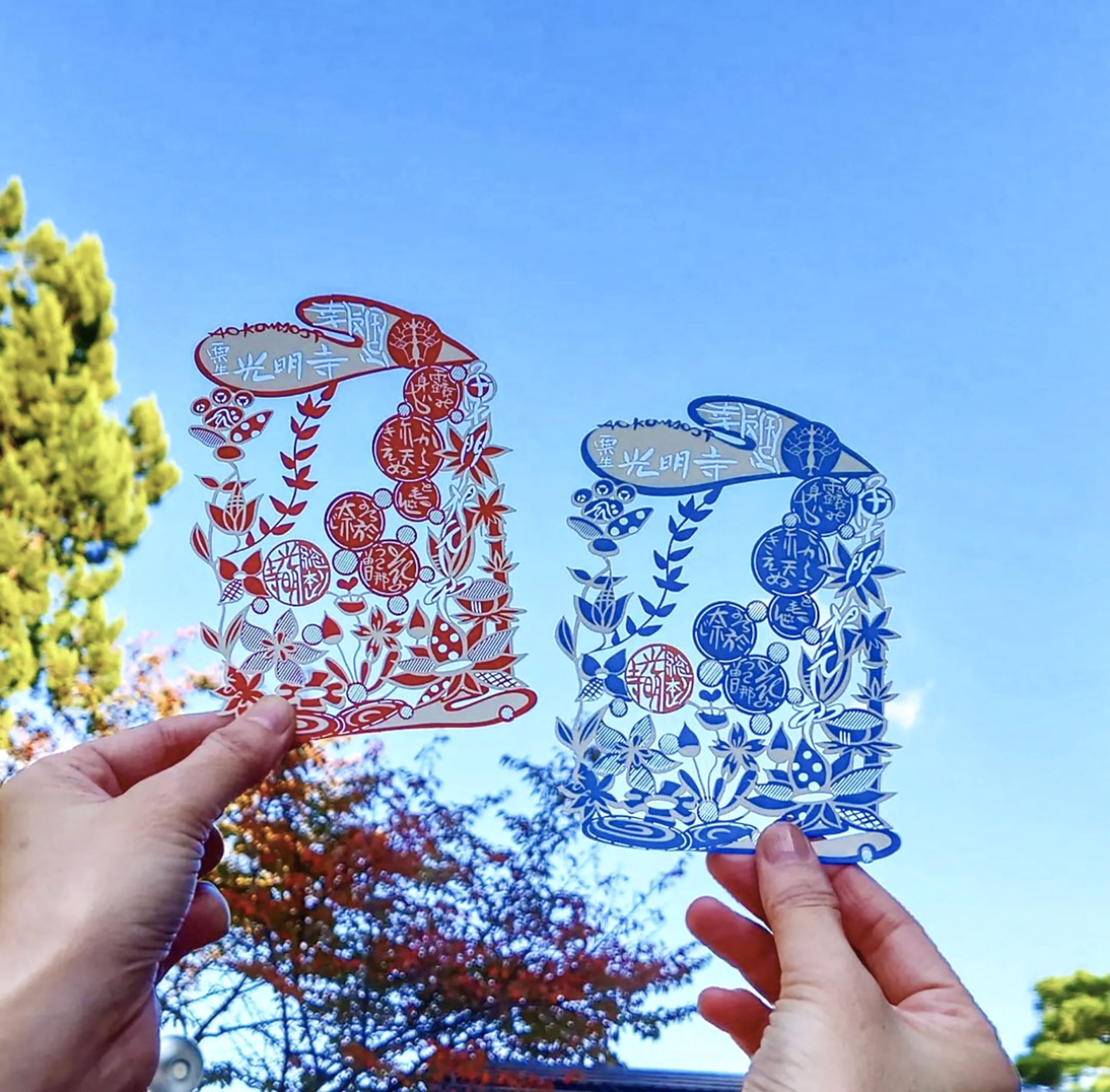 紅葉を愛でたい気持ちを抑えつつ、ぜひ手に入れたいのが紅葉期限定の「ご詠歌切り絵朱印」(特別価格で各600円)。背景によって印象が変わる斬新なデザインで、青・赤・ピンク・緑・黄・紫色の全6色の展開です。通常は各800円なのでお得ですよ。