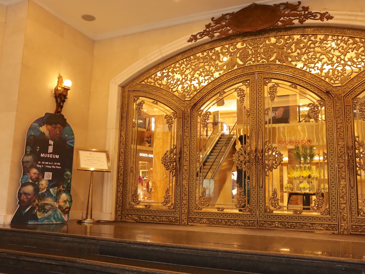 最初に紹介するのは、ベトナム初のメディアアートミュージアム、I-Museumです。ホアンキエム湖の南東にある老舗デパート「チャンティエン・プラザ」の5階の一角にあります。金ピカの扉、外壁には高級ブランドのロゴが並んでいるため、何となく入りにくい印象がありますが、そこは勇気を振り絞って!